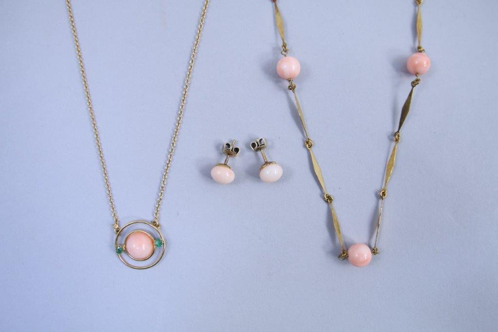 LOT composé d'un COLLIER, d'un PENDENTIF et sa CHAÎNE et deux CLOUS d'OREILLES en or jaune 750 millièmes ornés de cabochons et perles de corail.