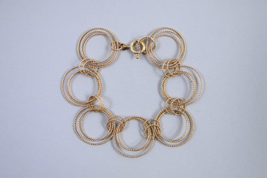 BRACELET en or jaune 750 millièmes à sept mailles de trois anneaux mobiles torsadés reliés par de petits anneaux latéraux.