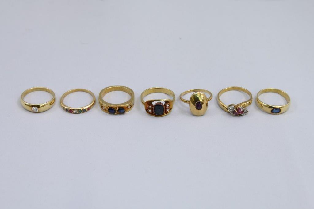 LOT de sept BAGUES en or jaune 750 millièmes ornées...