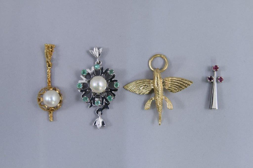RÉUNION de quatre PENDENTIFS, deux en or jaune 750 millièmes et deux en or blanc. L'un à décor de poisson-volant, les trois autres ornés de pierres et de perles.