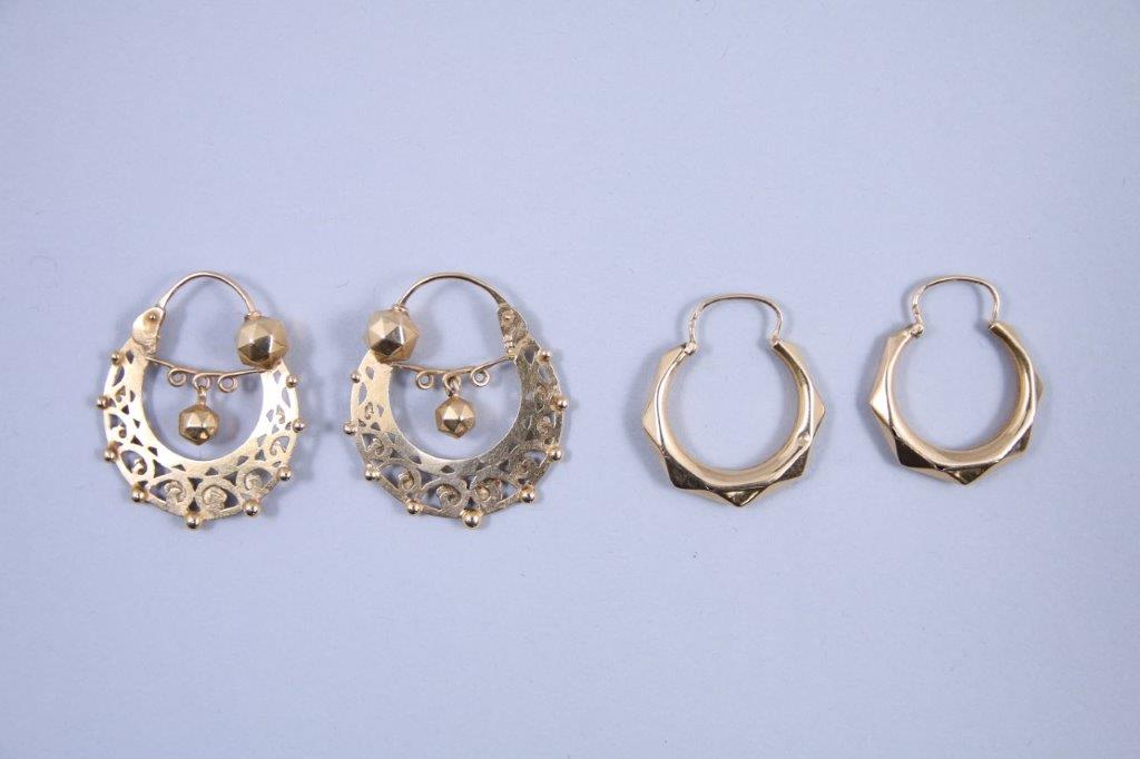 Deux PAIRES de BOUCLES d'OREILLES en or jaune 750 millièmes, dont une belle paire de CRÉOLES SAVOYARDES (5,8 g.).