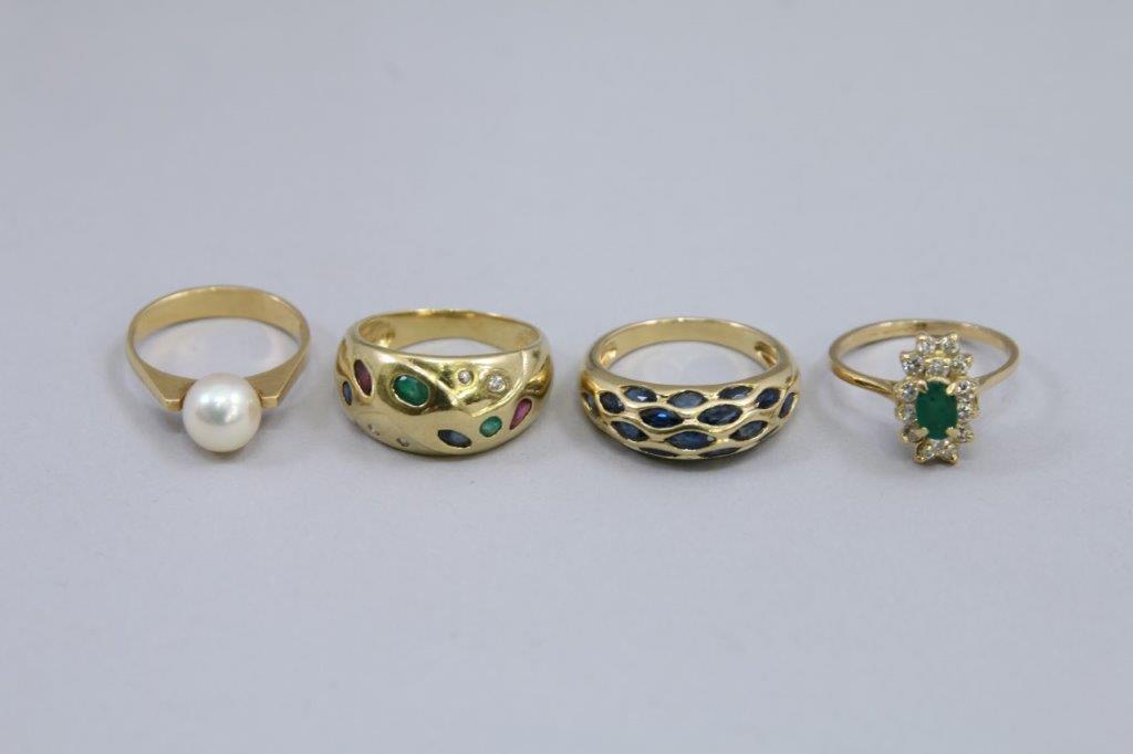 LOT de quatre BAGUES en or jaune 750 millièmes, ornées d'une perle, de pierres de couleurs et de petits DIAMANTS.