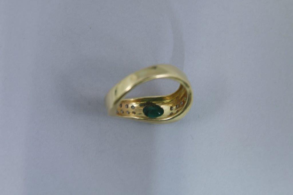 BAGUE en or jaune 750 millièmes, à la forme virevoltante ornée d'une ÉMERAUDE et de seize petits DIAMANTS.
