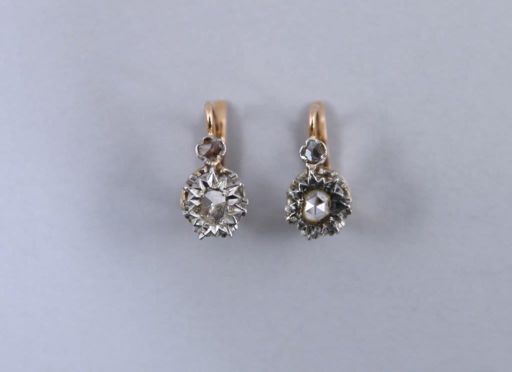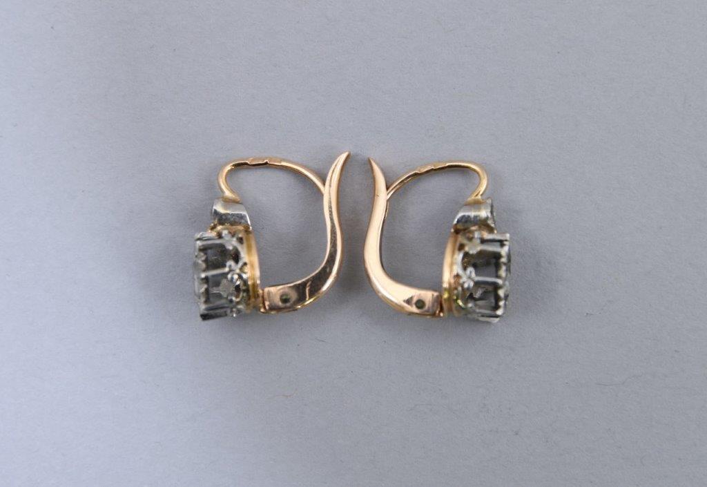 PAIRE de BOUCLES d'OREILLES DORMEUSES en or jaune ornées de quatre DIAMANTS pour un poids total d'environ 0,10 carats de taille ancienne.