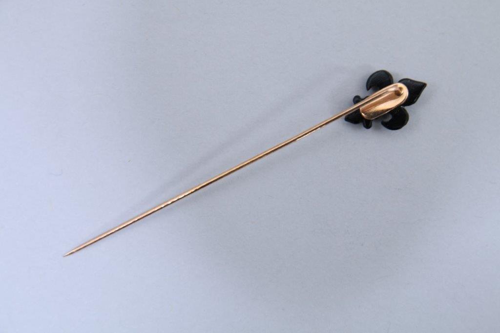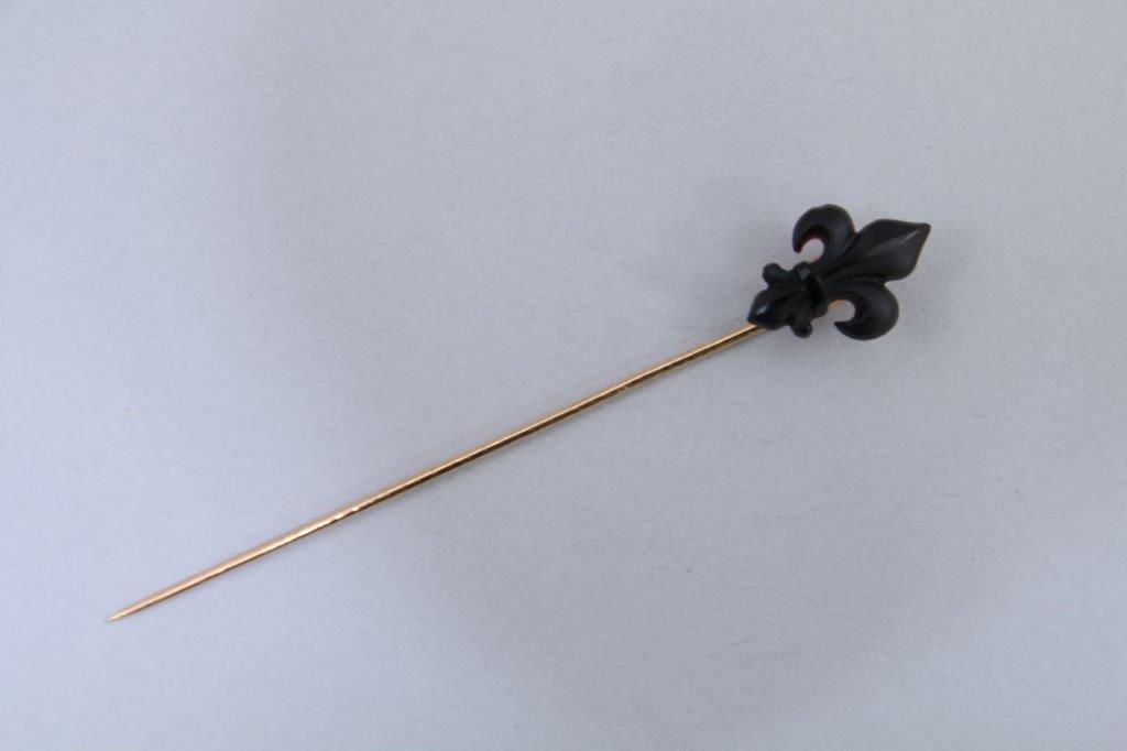 JOINT : ÉPINGLE en or ornée d'une FLEUR de LYS en pierre noire. Poids brut 1,2 g.