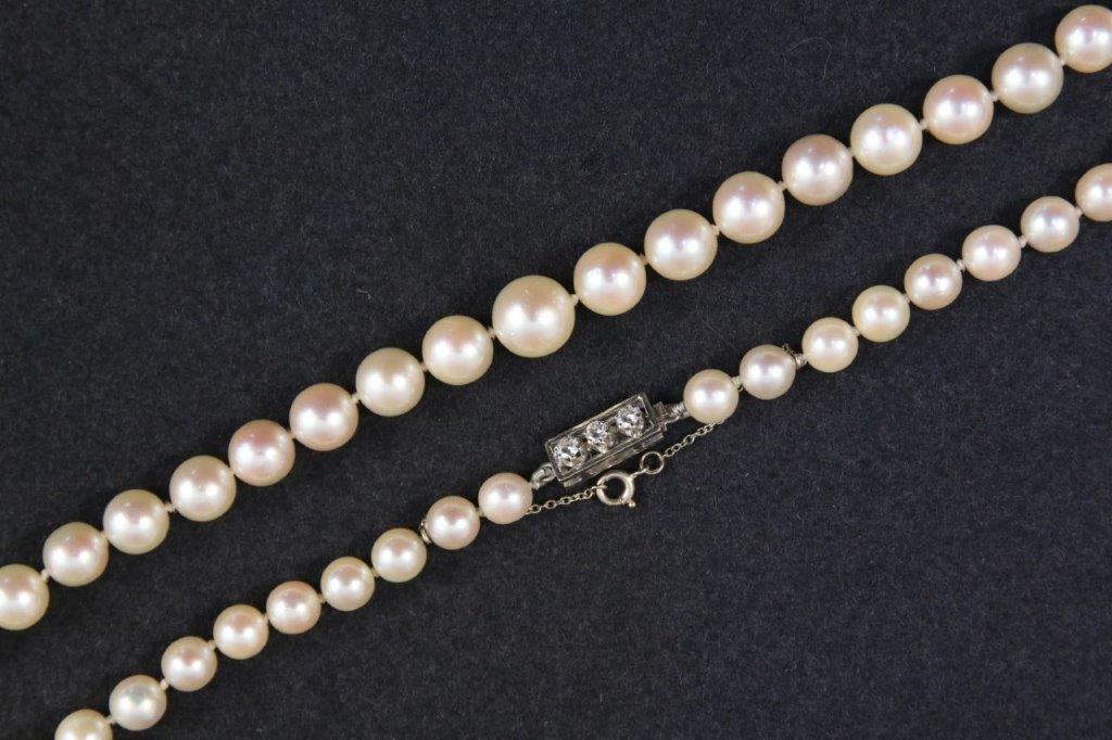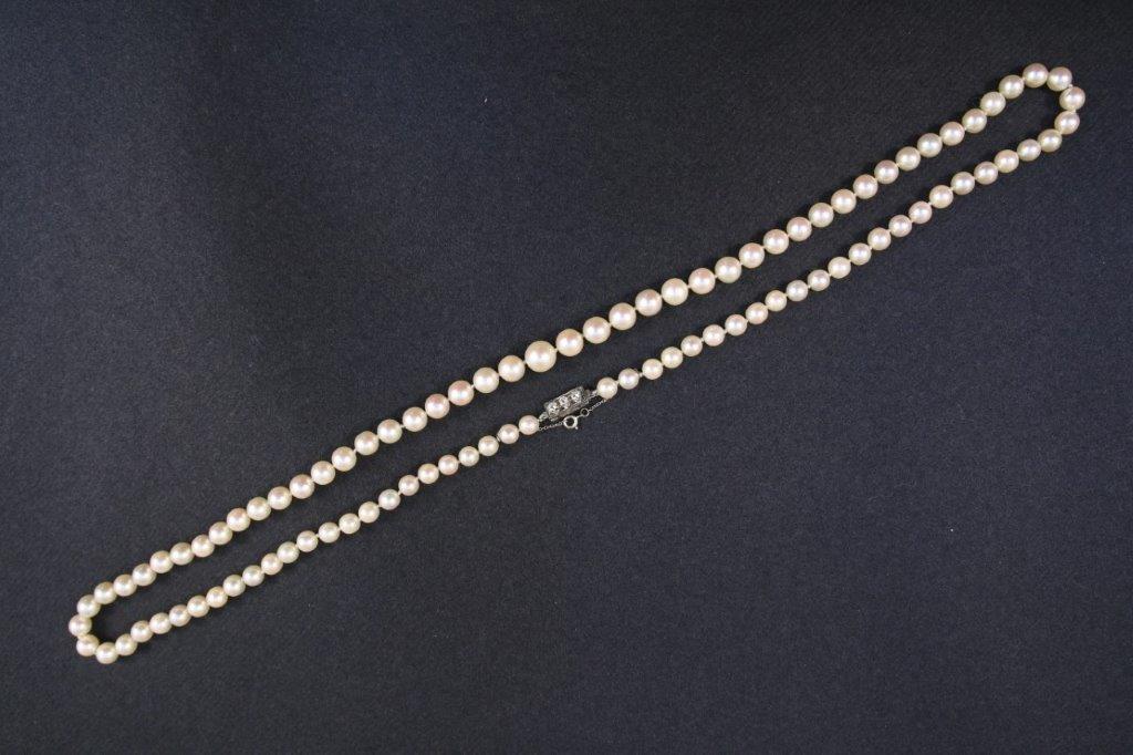 - un COLLIER de quatre-vingt-treize perles de culture en chute, fermoir orné de trois DIAMANTS ronds de taille brillant.