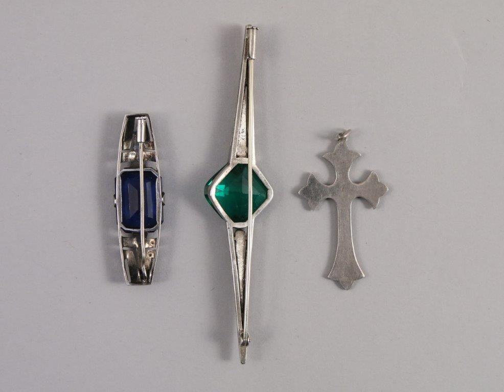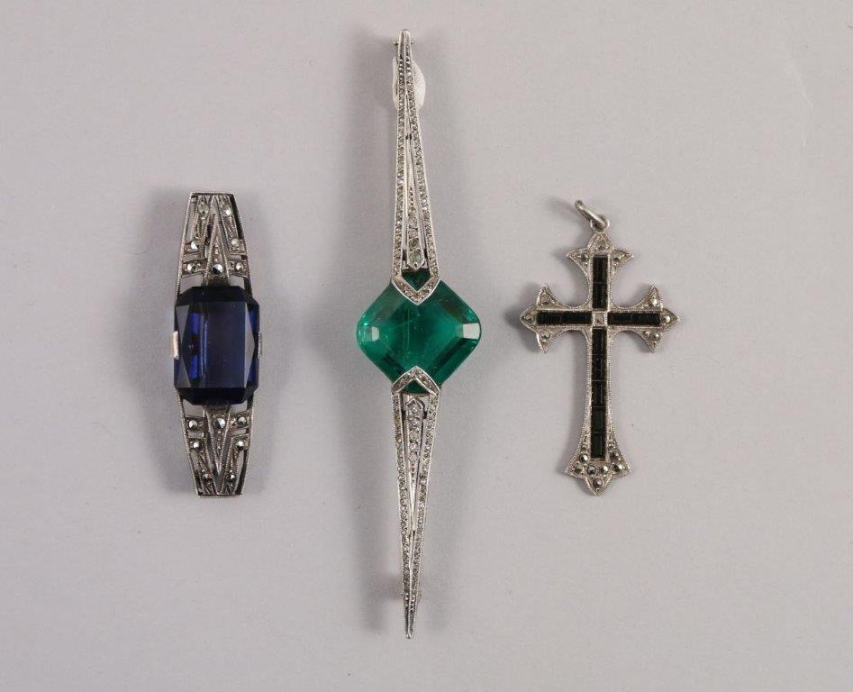 Deux BROCHES BARETTES et une CROIX PENDENTIF en or blanc 750 millièmes, ornées de pierres du Rhin avec une pierre verte (ÉMERAUDE ?), verre bleu ou ONYX.