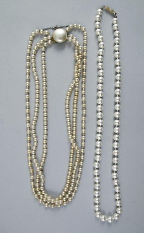 Deux COLLIERS de PERLES : le premier à un rang CHOKER (Long. 54 cm.), le second à trois rangs (Long. 45 cm, un rang à refixer).