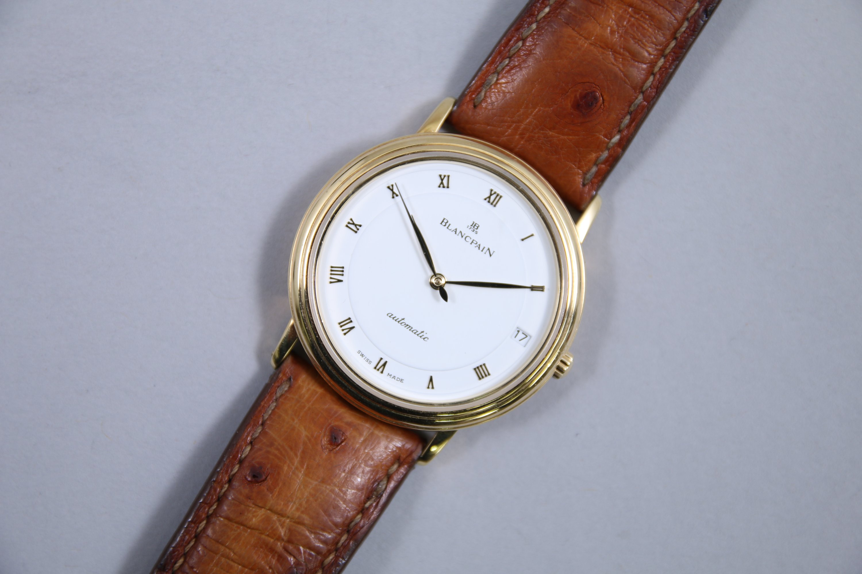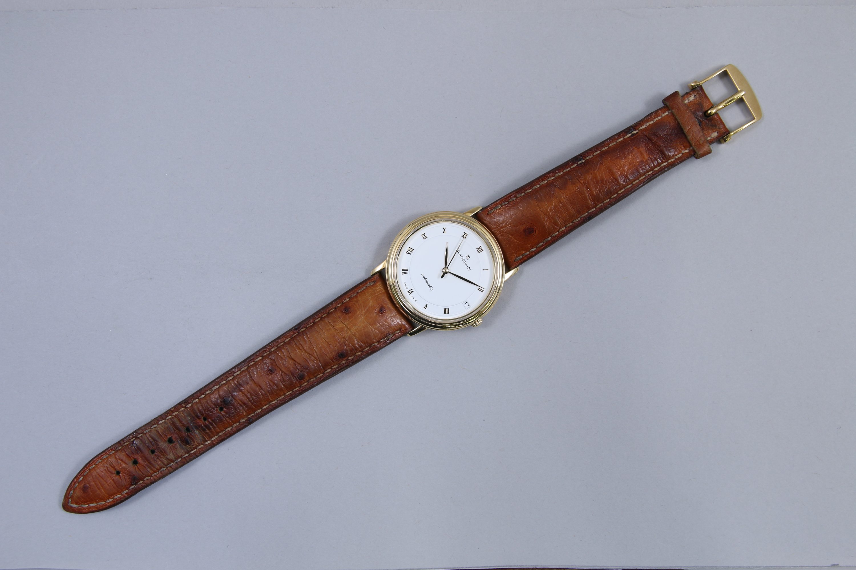 à mouvement automatique, en or jaune 750 millièmes. Le cadran émaillé blanc, figurant les heures en chiffres romains, la date indiquée dans un guichet à 3 heures.