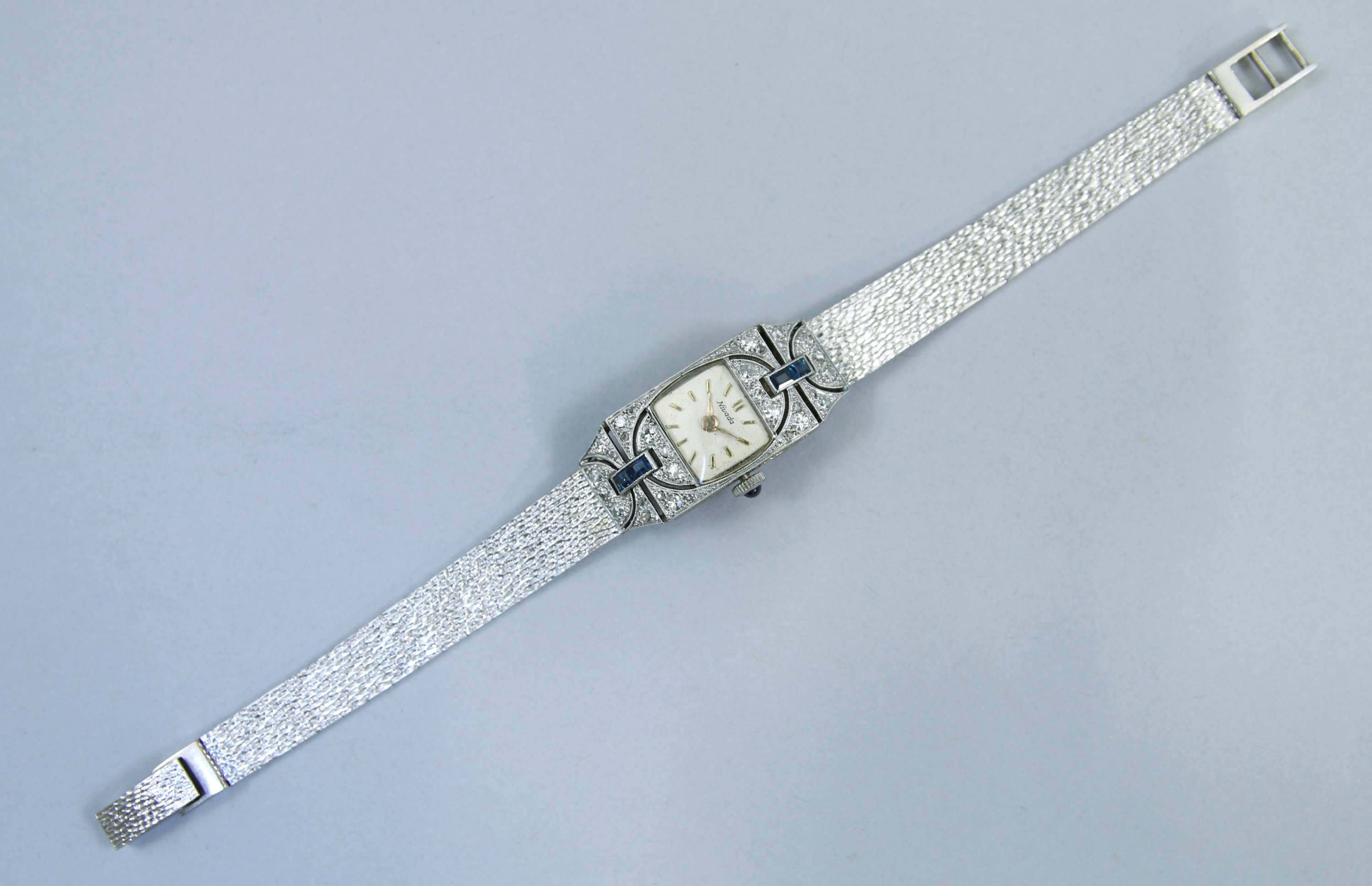 en or blanc 750 millièmes, pavage de brillants et quatre SAPHIRS. Le cadran gradué pour les heures, signé NIVADA SWISS MADE. Mouvement mécanique. Remontoir orné d'une pierre bleue à trois heures. Bracelet ouvragé et articulé en or blanc.