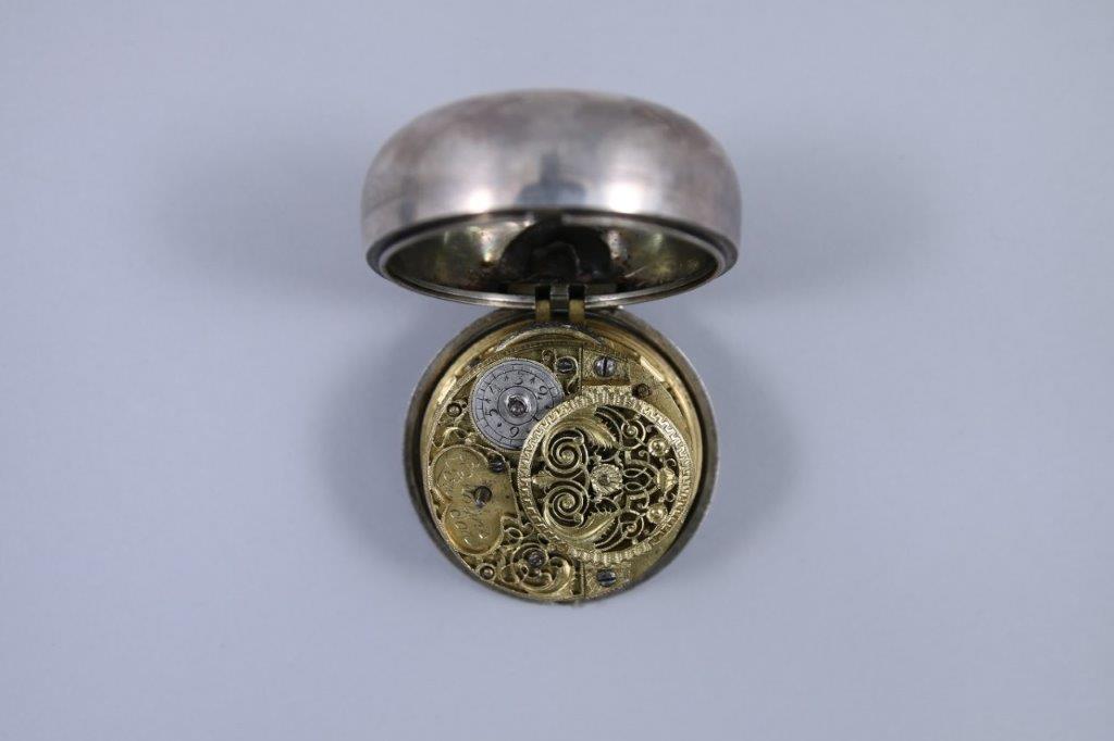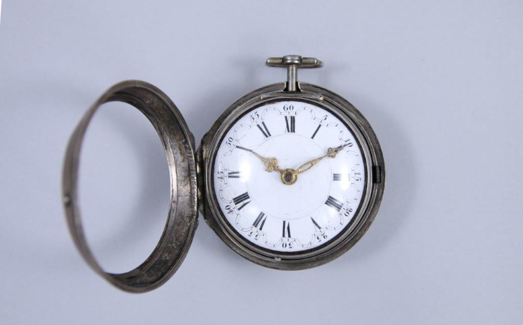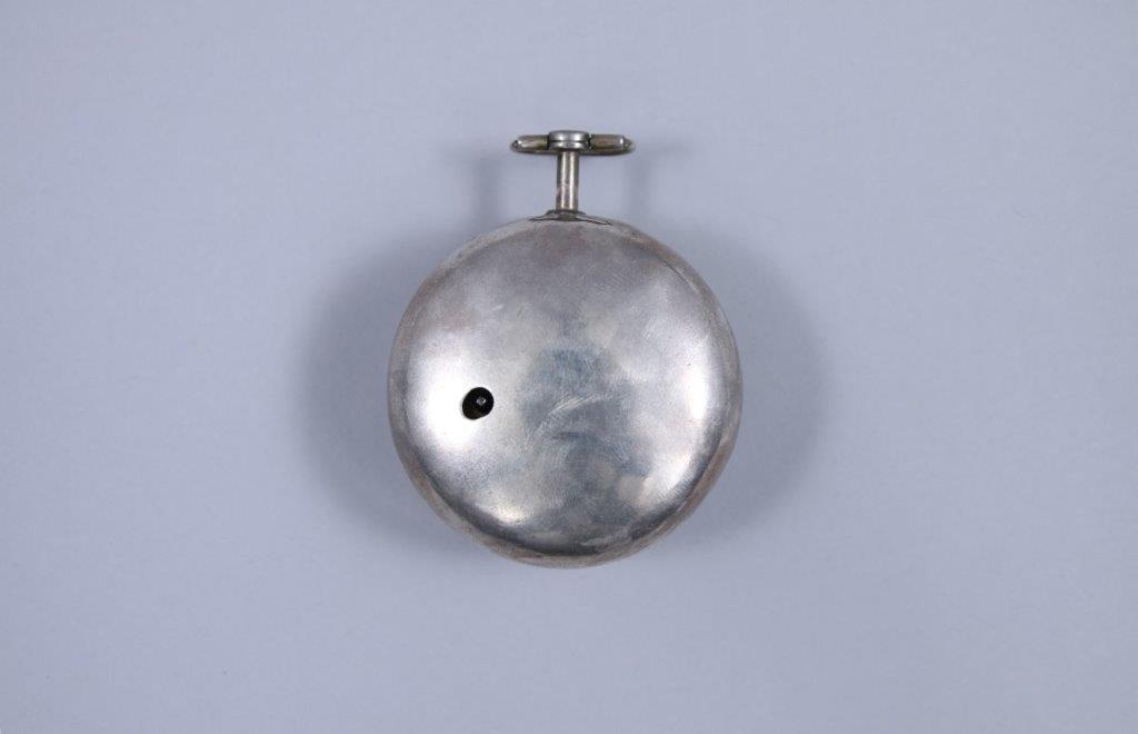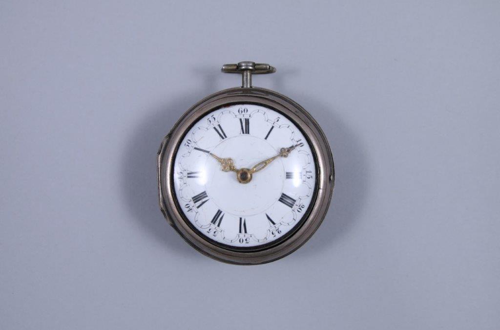 Montre en argent. Le cadran émaillé blanc figurant les heures en chiffres romains et les minutes en chiffres arabes autour d'un chemin de fer formant des arcatures.