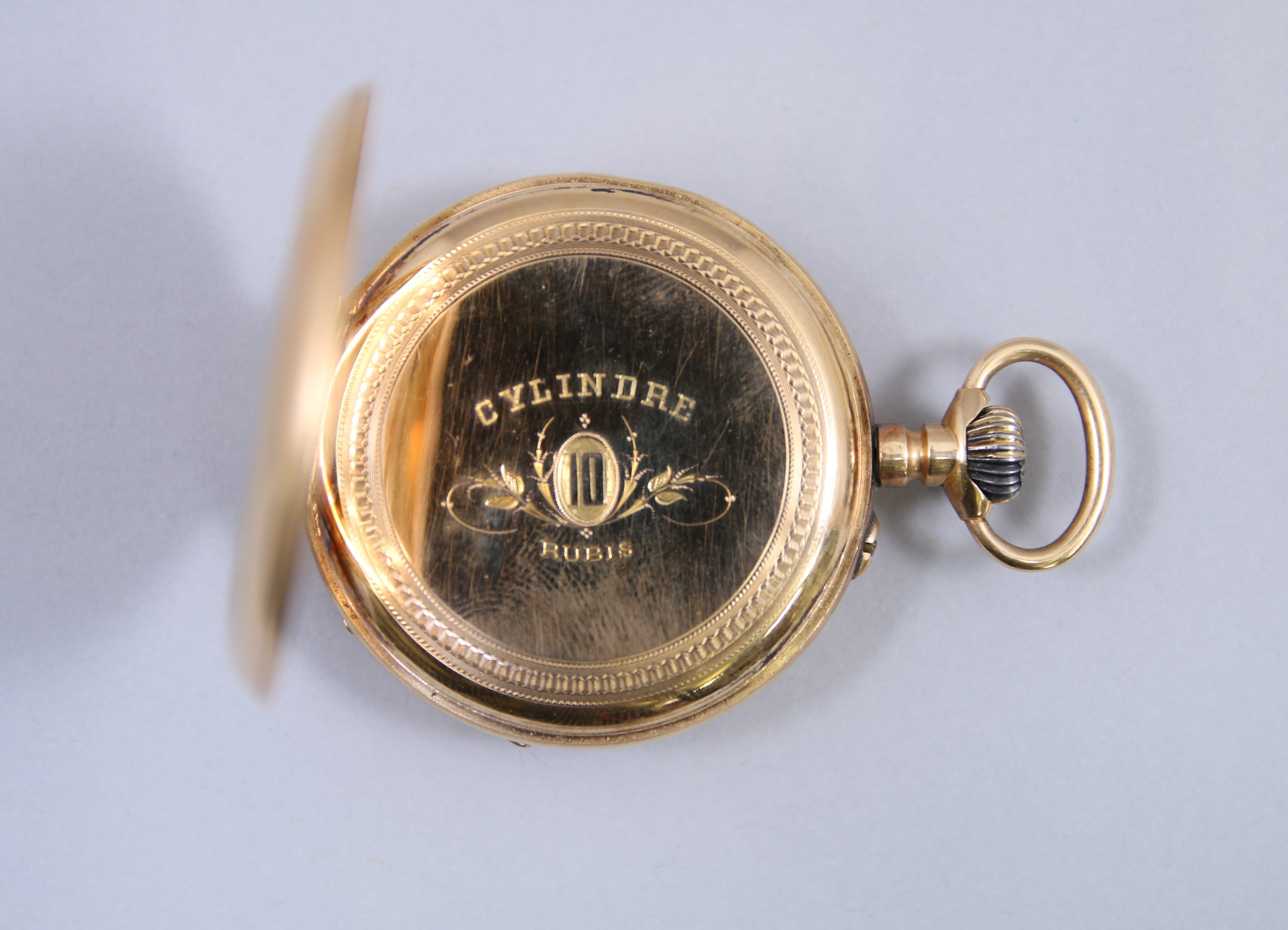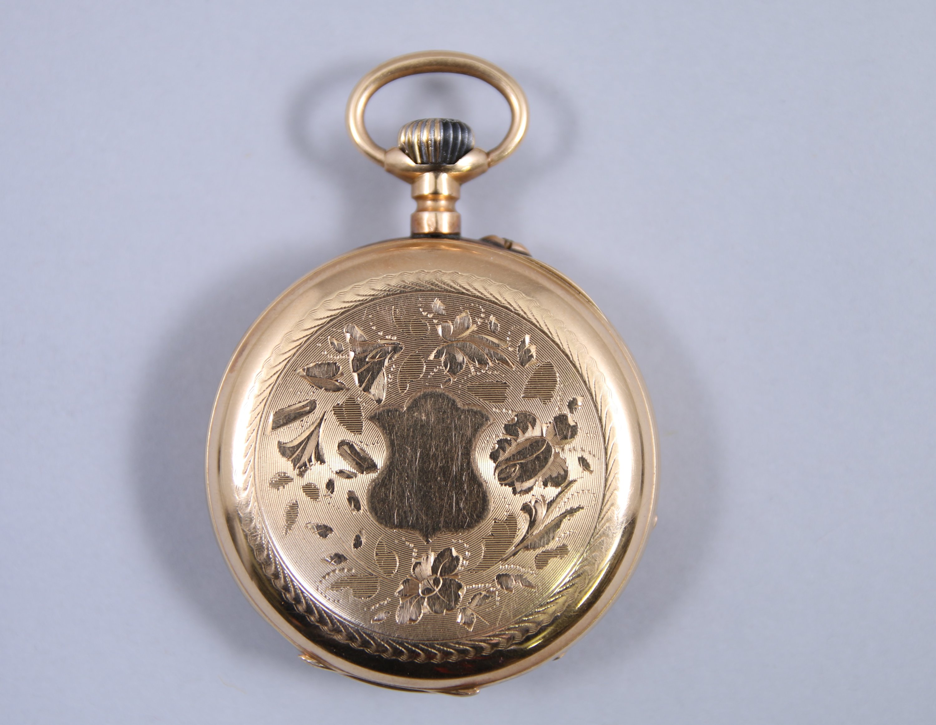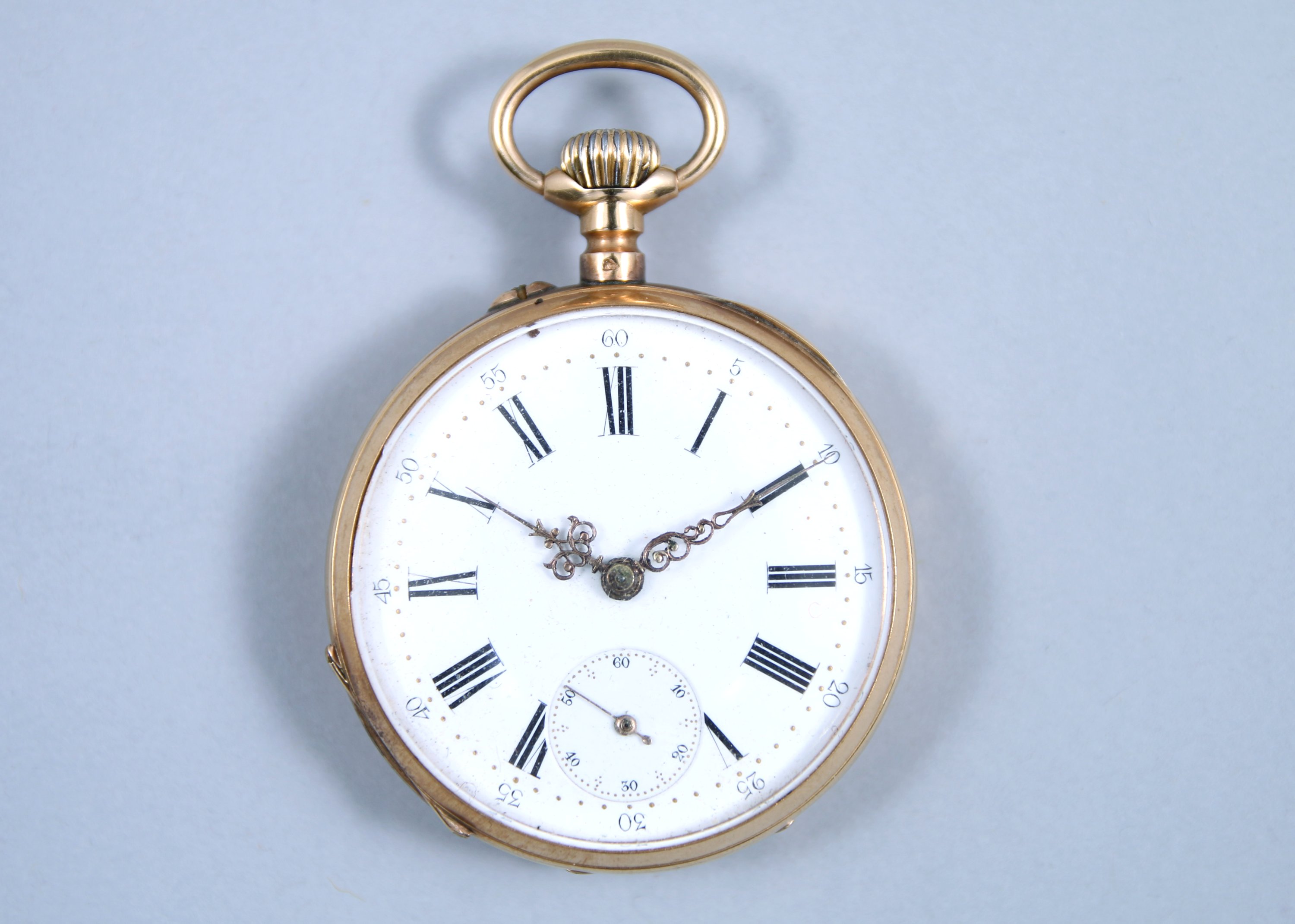 en or jaune 750 millièmes, double cadran émaillé avec un chemin de fer pour les minutes et les heures en chiffres romains ; cadran des secondes à six heures. Remontoir à midi. Le boitier gravé d'un écusson et de fleurs.