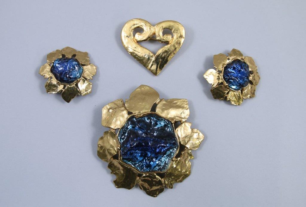 Yves SAINT-LAURENT et Robert GOOSSENS. PARURE FLEUR composée d'une BROCHE formant PENDENDTIF et d'une PAIRE de CLIPS d'OREILLES en métal doré, le cœur en résine bleue.