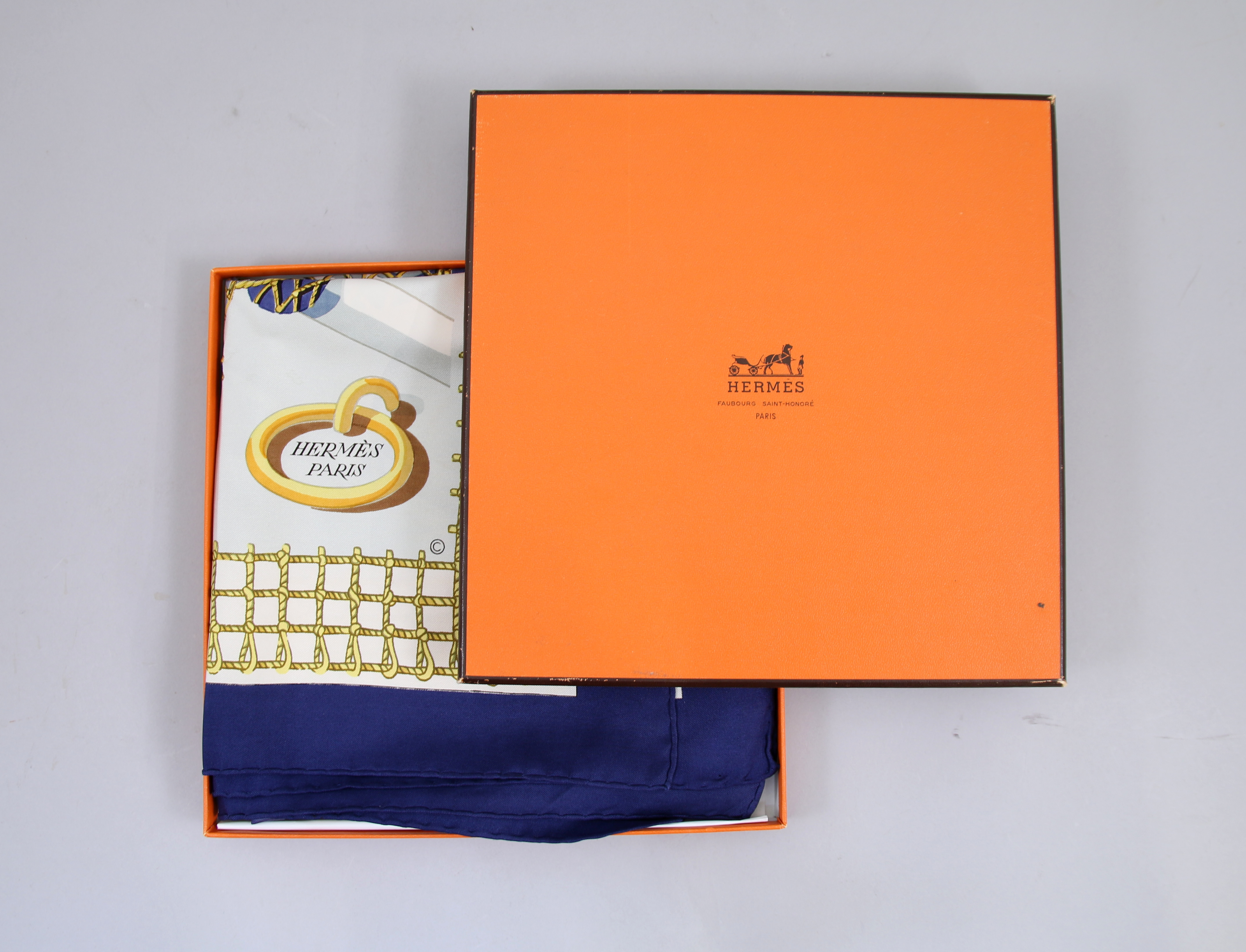 HERMES. CARRÉ en soie "LES RAISINS DE LA MER" à fond blanc à bordure bleue. Modèle créé par Peron.