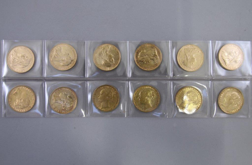 ANGLETERRE. 12 PIÈCES 1 SOUVERAIN OR. Reine Victoria. 1 x 1876, 1 x 1879, 1 x 1880, 1 x 1882, 1 x 1885, 1 x 1886, 3 x 1893, 2 x 1894, 1 x 1900.