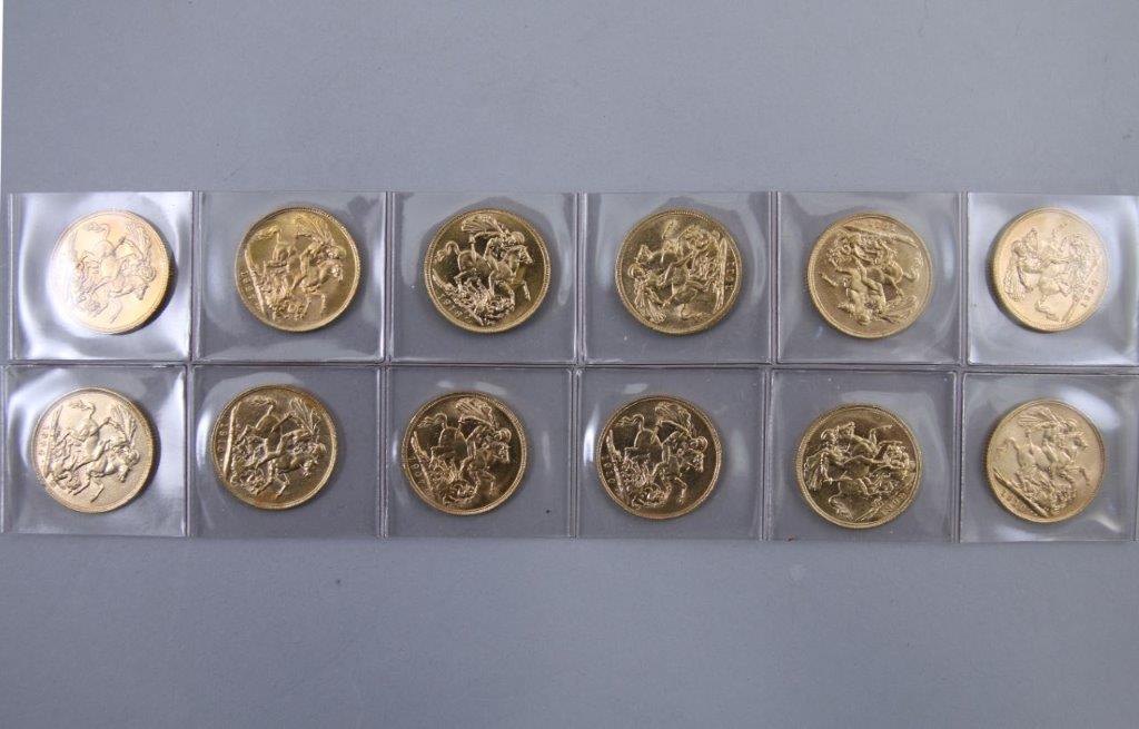 ANGLETERRE. 12 PIÈCES 1 SOUVERAIN OR. Georges V. 1 x 1904, 1 x 1907, 1 x 1908, 3 x 1910, 2 x 1911, 1 x 1914, 1 x 1918, 1 x 1927, 1 x 1929.