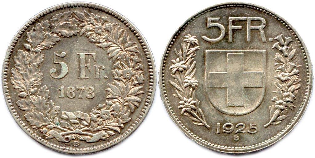 5 Francs Helvetia 1873 (rare) et 5 Francs Confédération Helvétique 1925 Berne.