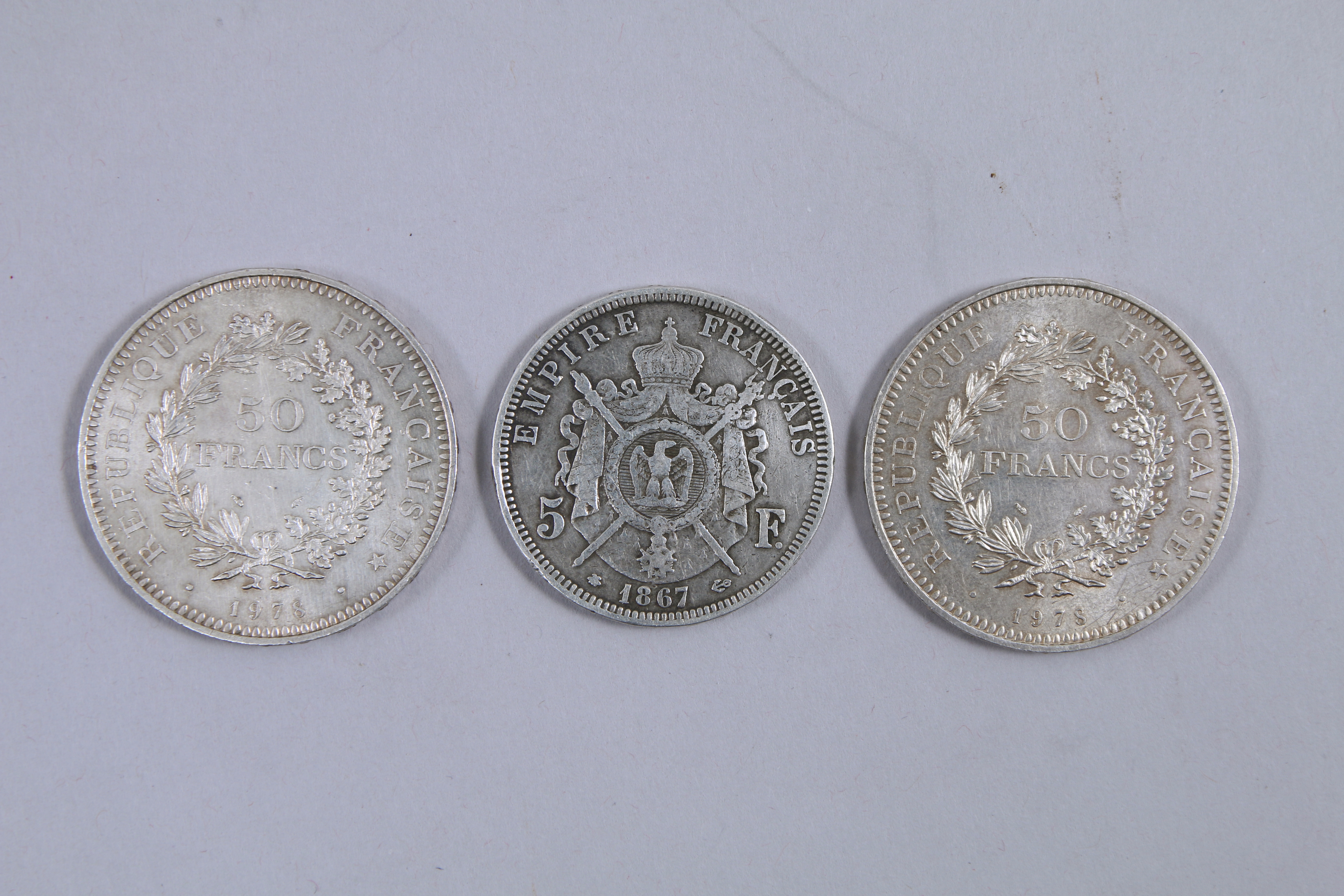 FRANCE. 3 pièces en argent : 2 x 50 francs Hercule 1978, 1 x 5 francs Napoléon III 1867.