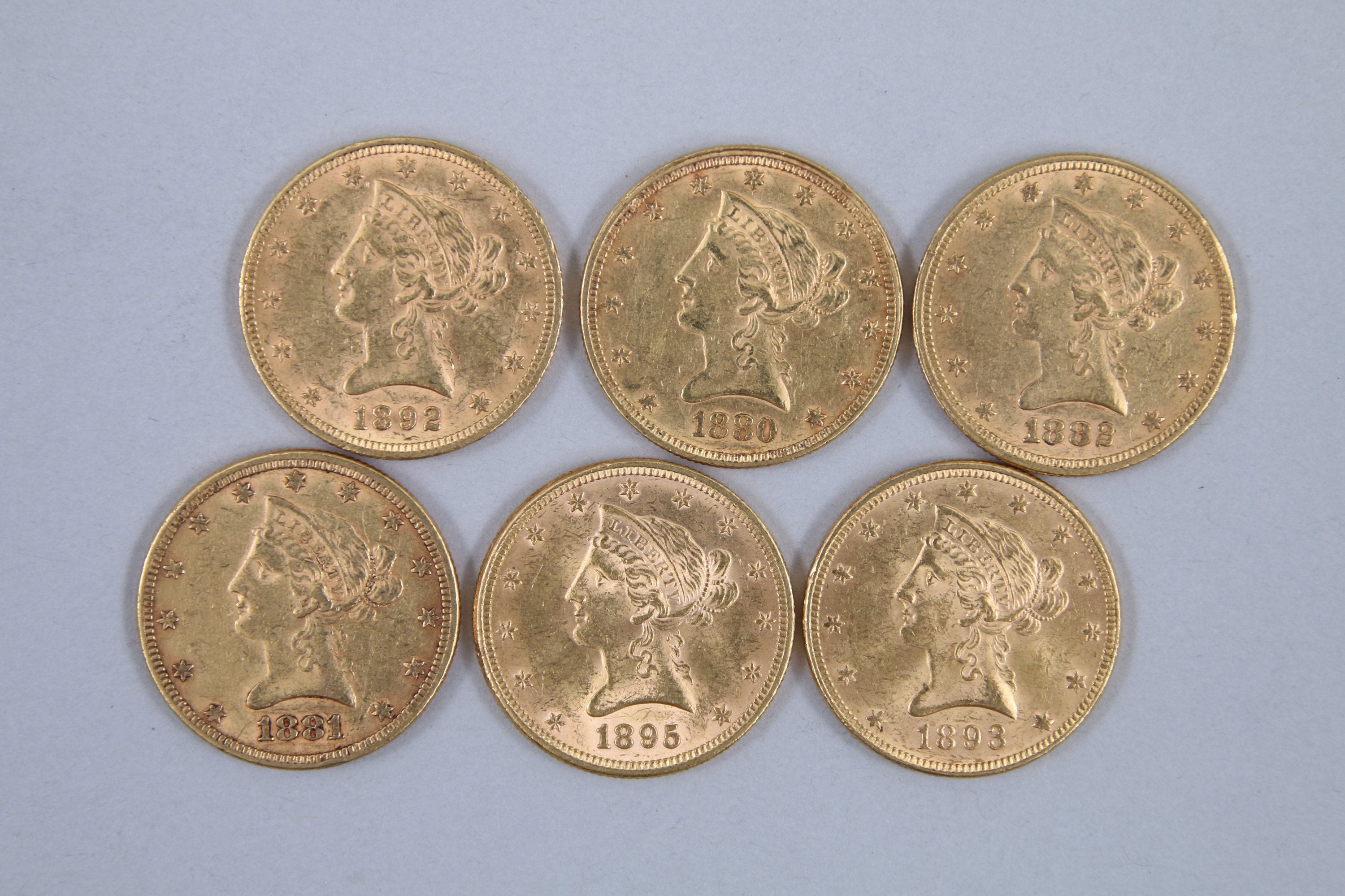 ETATS-UNIS. 6 PIÈCES 10 DOLLARS OR. 1880, 1881, 1882, 1892,...