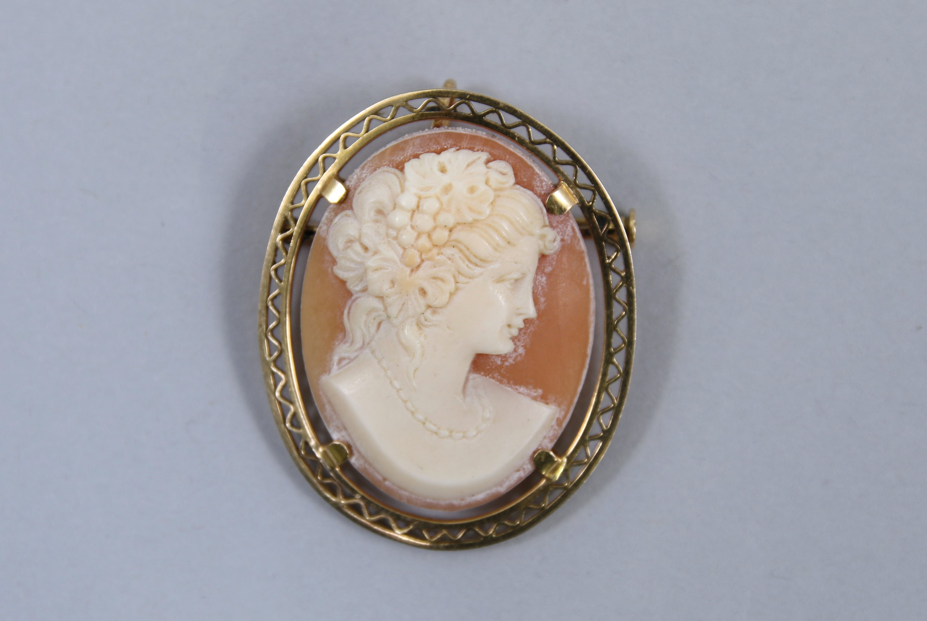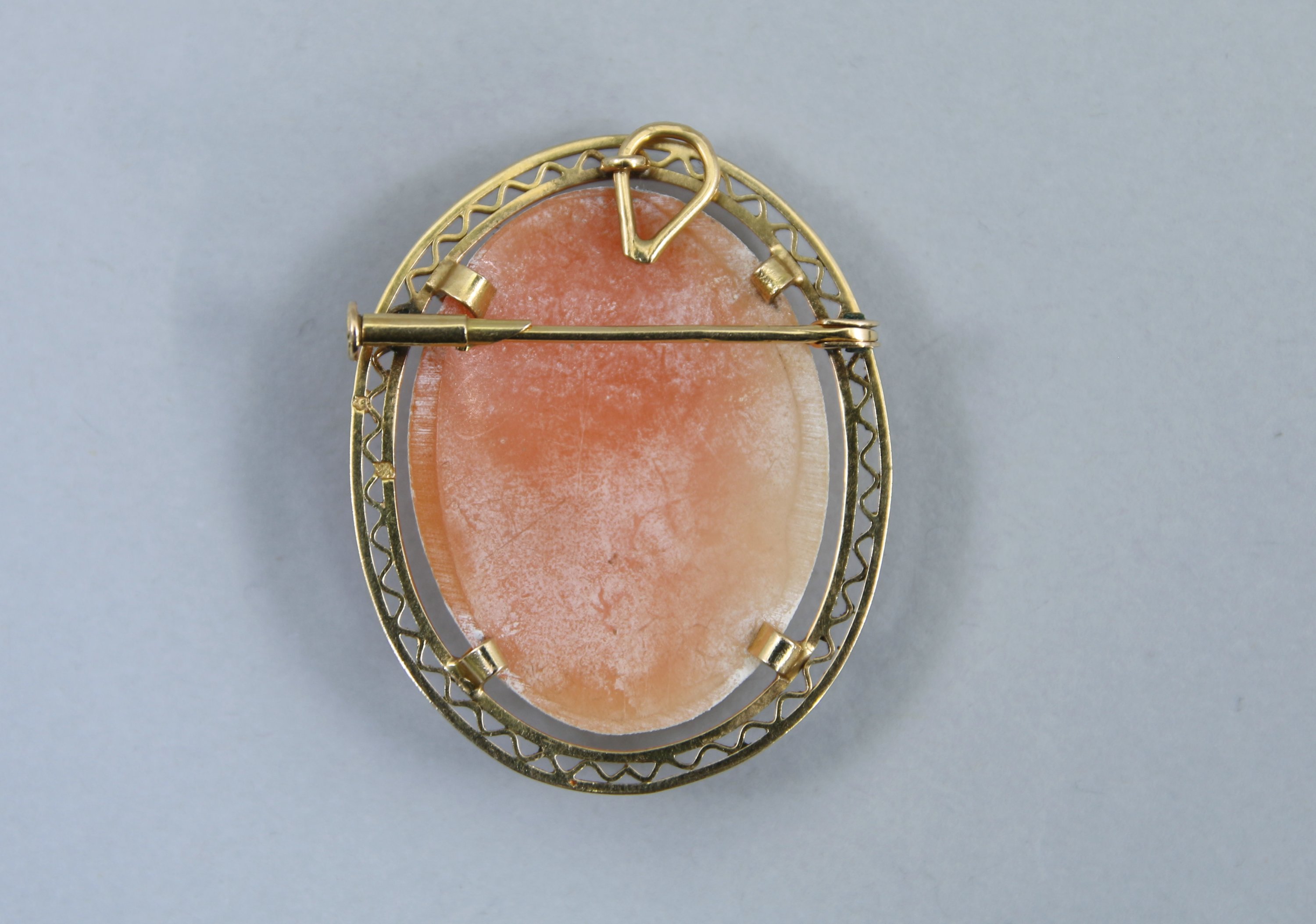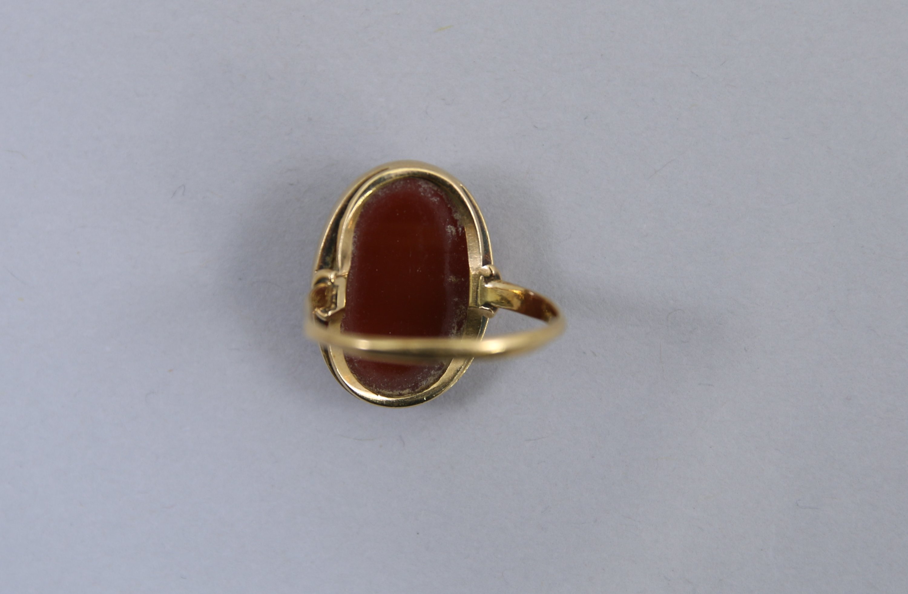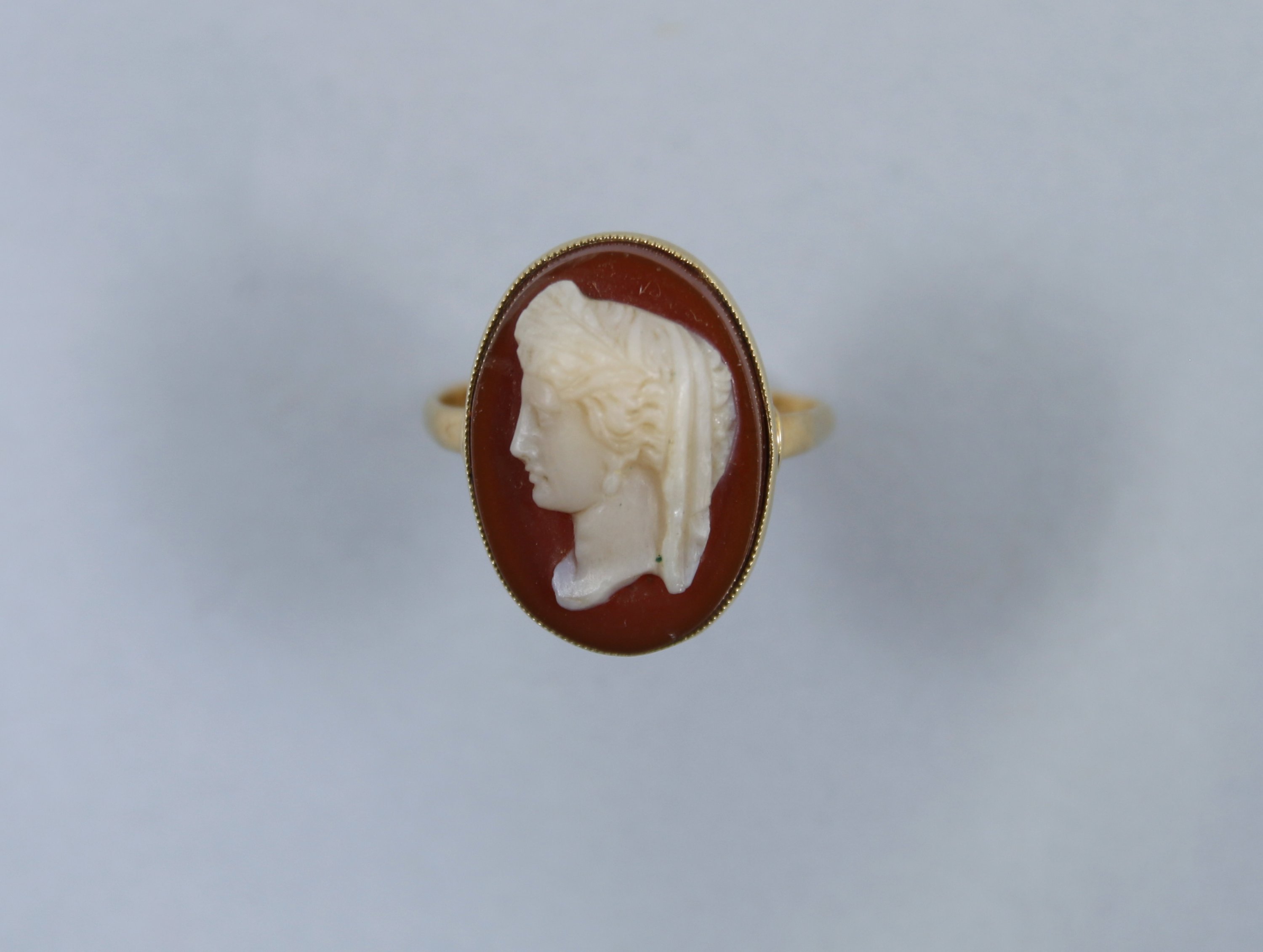 PARURE aux CAMÉES à l'ANTIQUE en or jaune 750 millièmes composée d'une BAGUE en CORNALINE au profil de femme à l'antique tourné vers la gauche et d'une BROCHE formant PENDENTIF en COQUILLE au profil de femme à l'antique tourné vers la droite sur fond rouge.