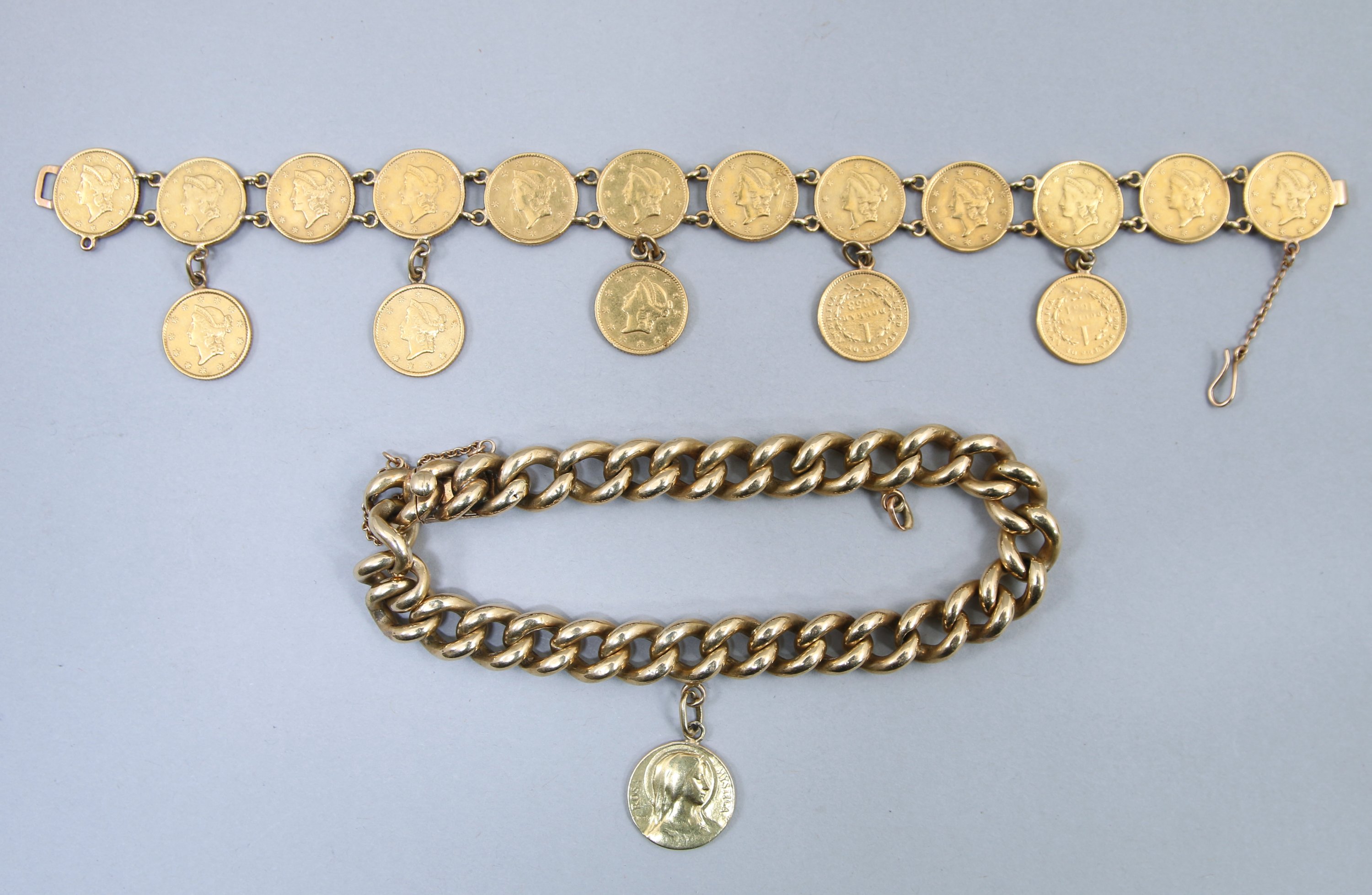 Deux BRACELETS en or jaune 750 millièmes, le premier orné de dix-sept PIÈCES de UN DOLLAR (1851-1854) de diverses années (1851 X 3, 1852 X 1, 1853 X 7, 1854 X 3, 2 illisibles), le second à mailles, orné d'une médaille de la Vierge par Emile Dropsy. Le fermoir à chainette de sécurité.