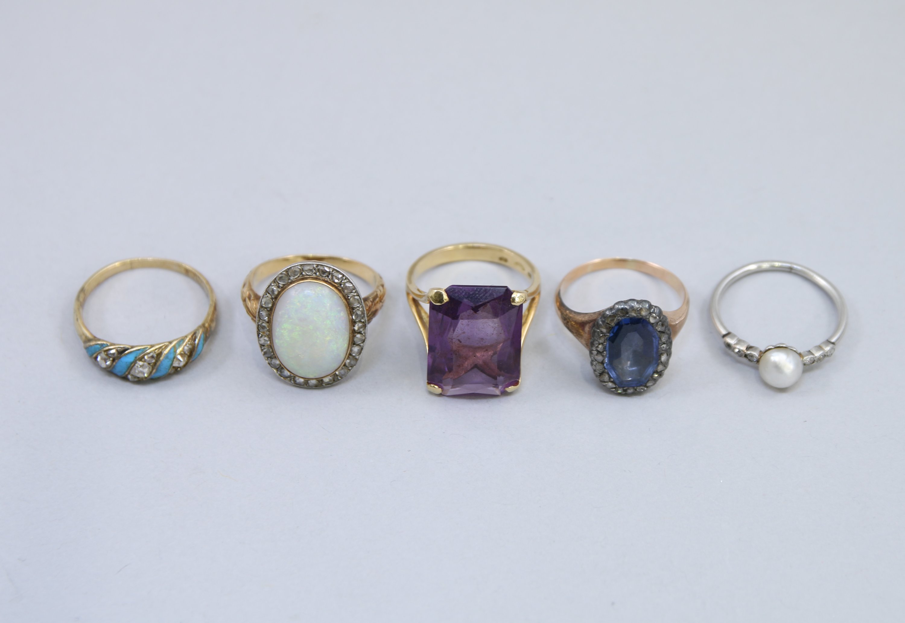 Cinq BAGUES dont quatre en or jaune 750 millièmes et une en or blanc 750 millièmes. La première à décor torsadé alternant turquoise et brillants, la deuxième ornée de nacre entourée de brillants, la troisième présentant une pierre bleue entourée de pierres du Rhin, la quatrième offrant une améthyste taillée, la cinquième présentant une perle entourée de brillants.