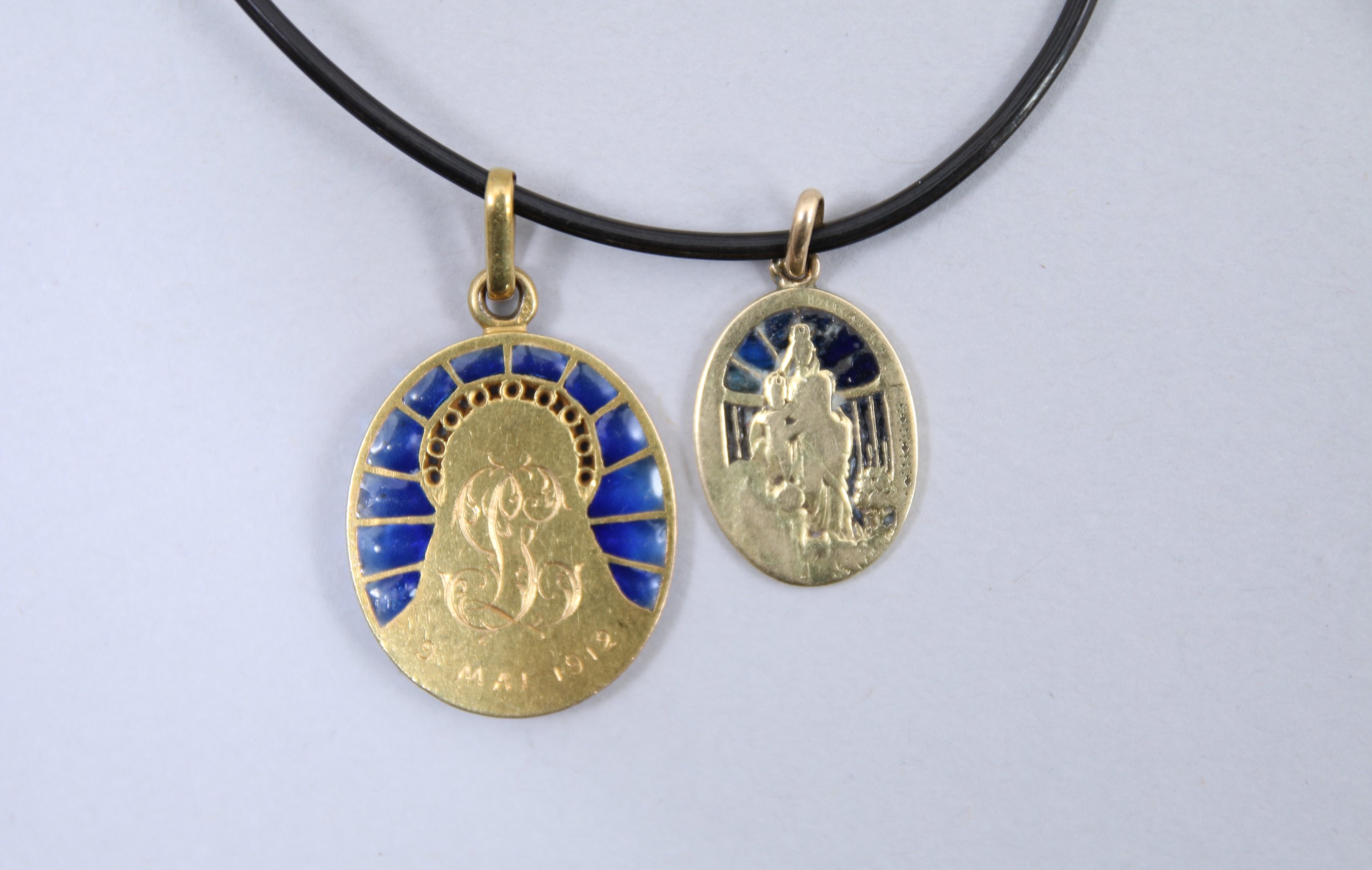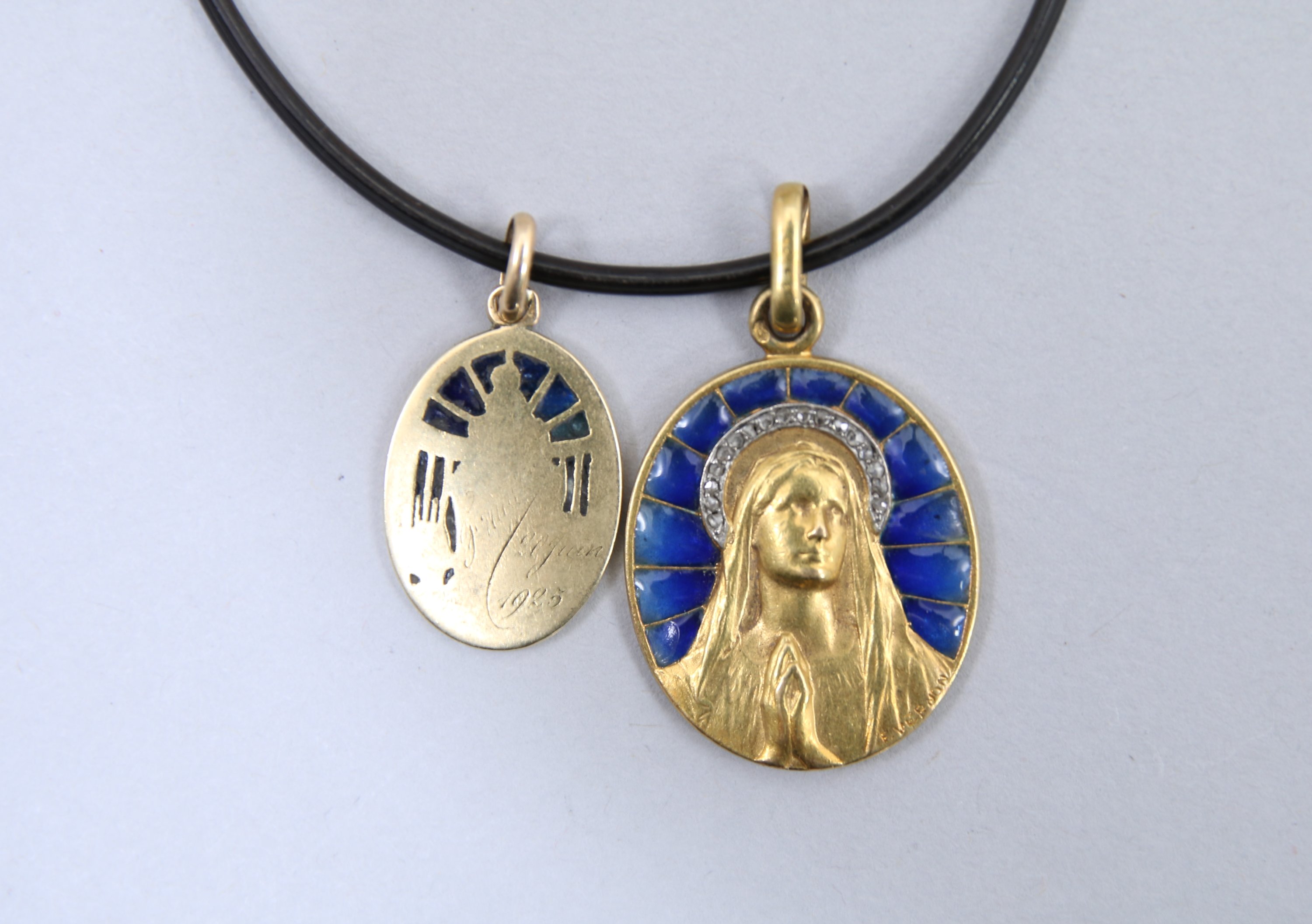 Deux MÉDAILLES en or jaune 750 millièmes sur fond d'émail bleu plique à jour à l'imitation du vitrail. La première par François de Vernon figurant une Vierge en prière auréolé par un pavage de brillants. Le revers chiffré GL et daté 9 mai 1912. La seconde figurant la Vierge à l'Enfant avec les inscriptions "Maria Virginis". Le revers gravé "Françoise 20 janvier 1925".