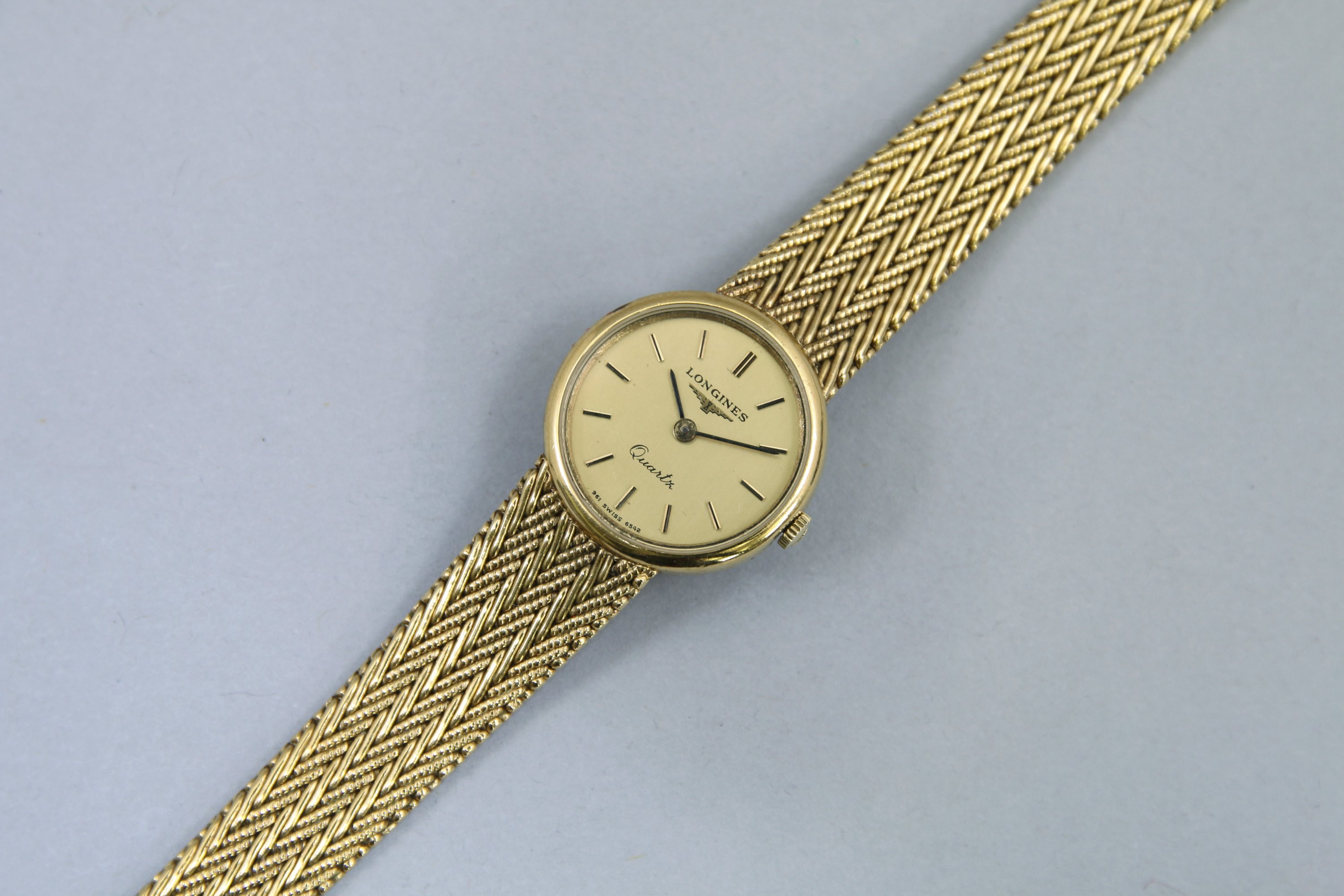 LONGINES. MONTRE BRACELET de dame en métal doré. Le cadran de forme circulaire indiquant les heures par des bâtonnets. Mouvement à quartz.