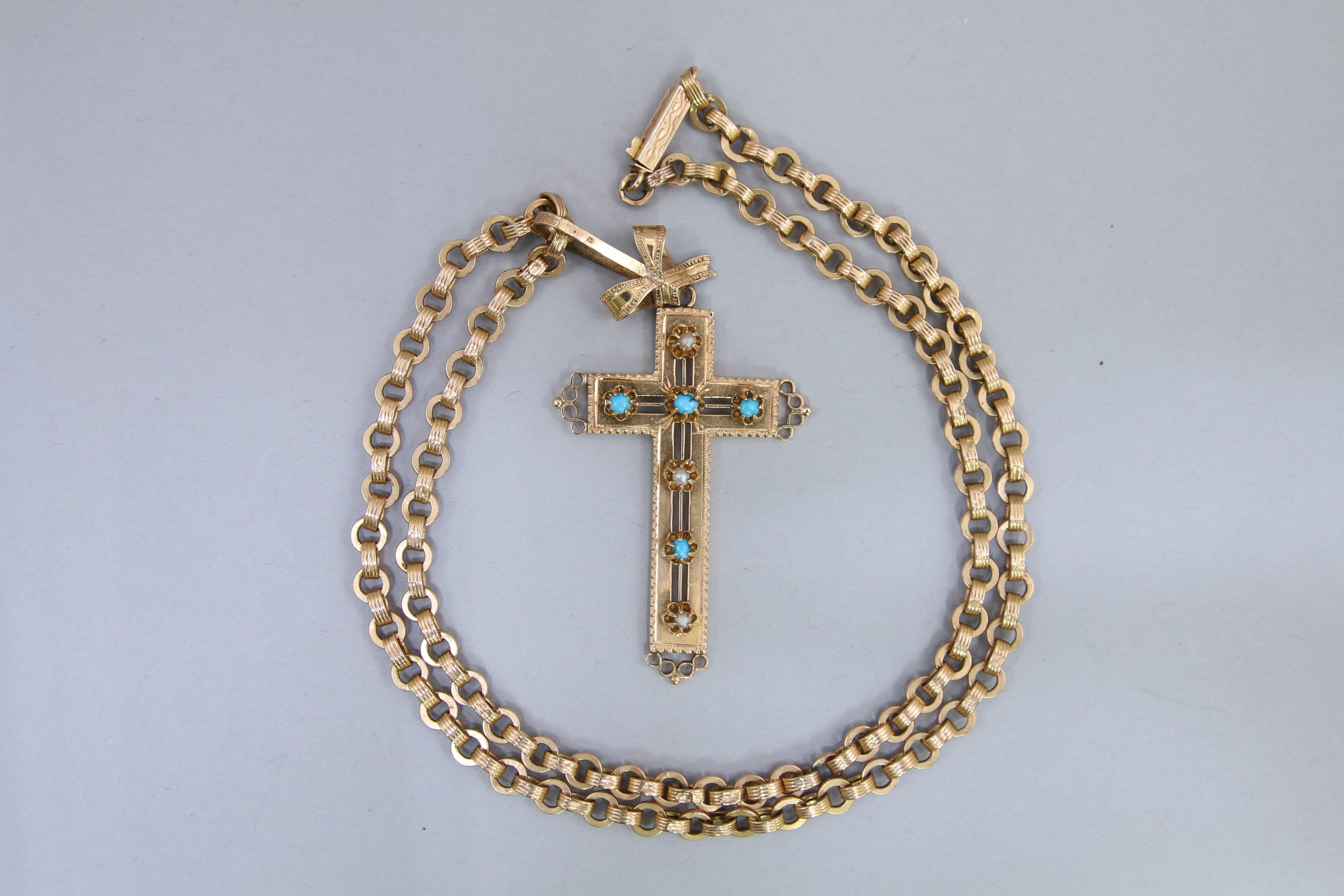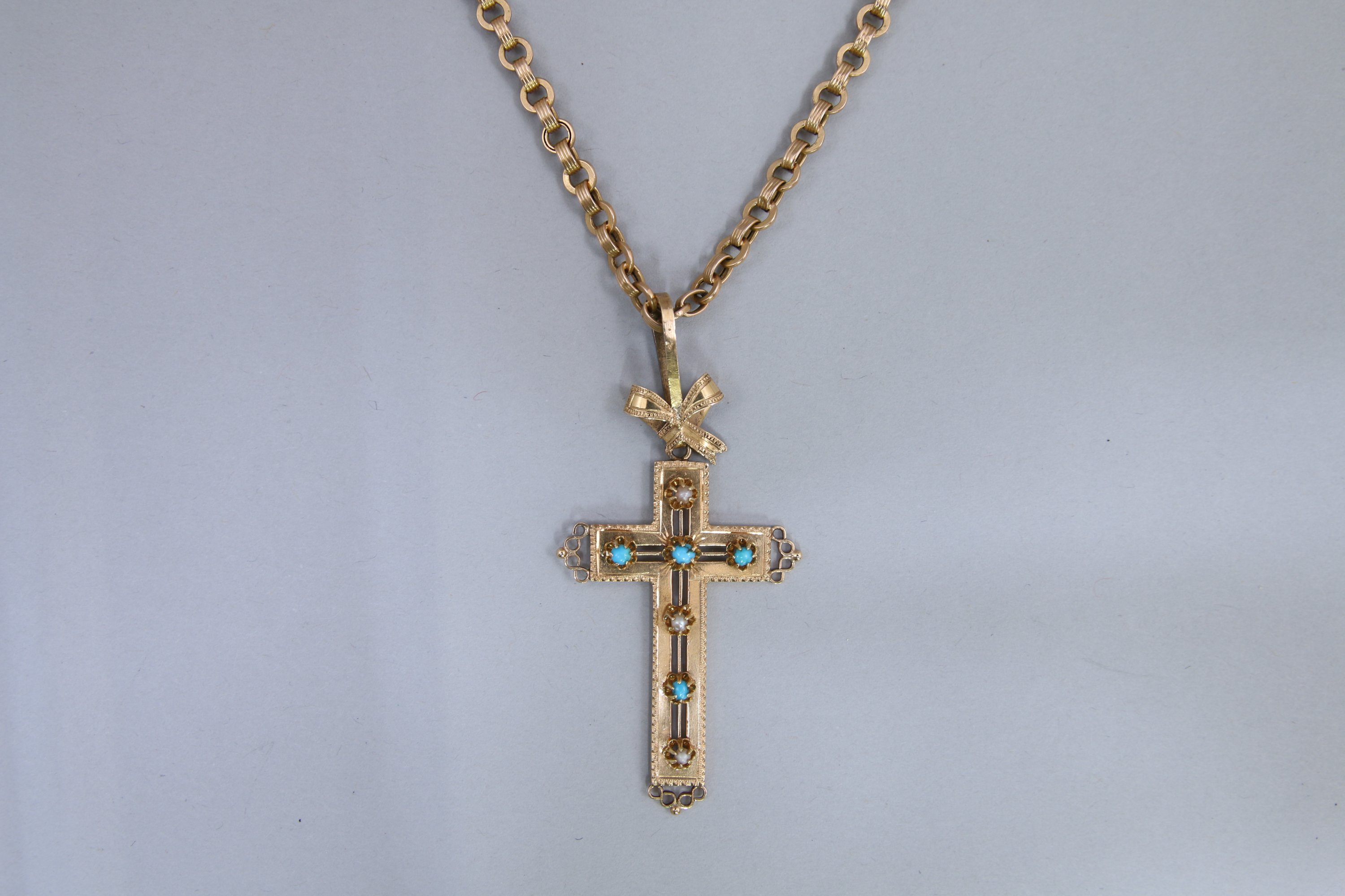 CROIX en pendentif et SA CHAÎNE en or jaune 750 millièmes. Le pendentif ornée de trois semences de perles et quatre perles de turquoise. La chaîne en alternance de cercles et de triples ovales transversaux.