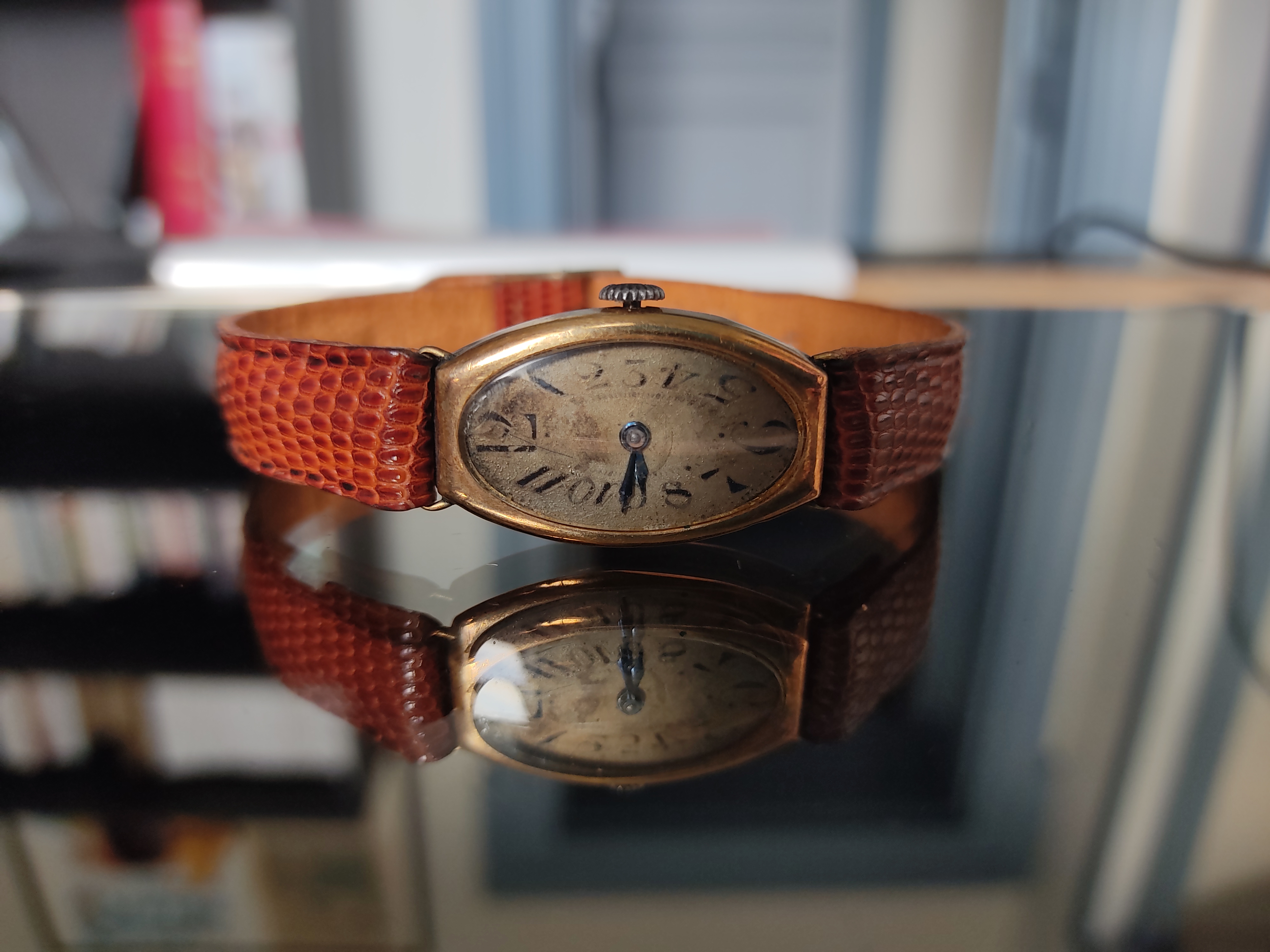 MONTRE BRACELET de DAME en or jaune 750 millièmes, le cadran de forme ovale indiquant les heures en chiffres arabes. Le boitier numéroté 80432. Poinçon LF.
