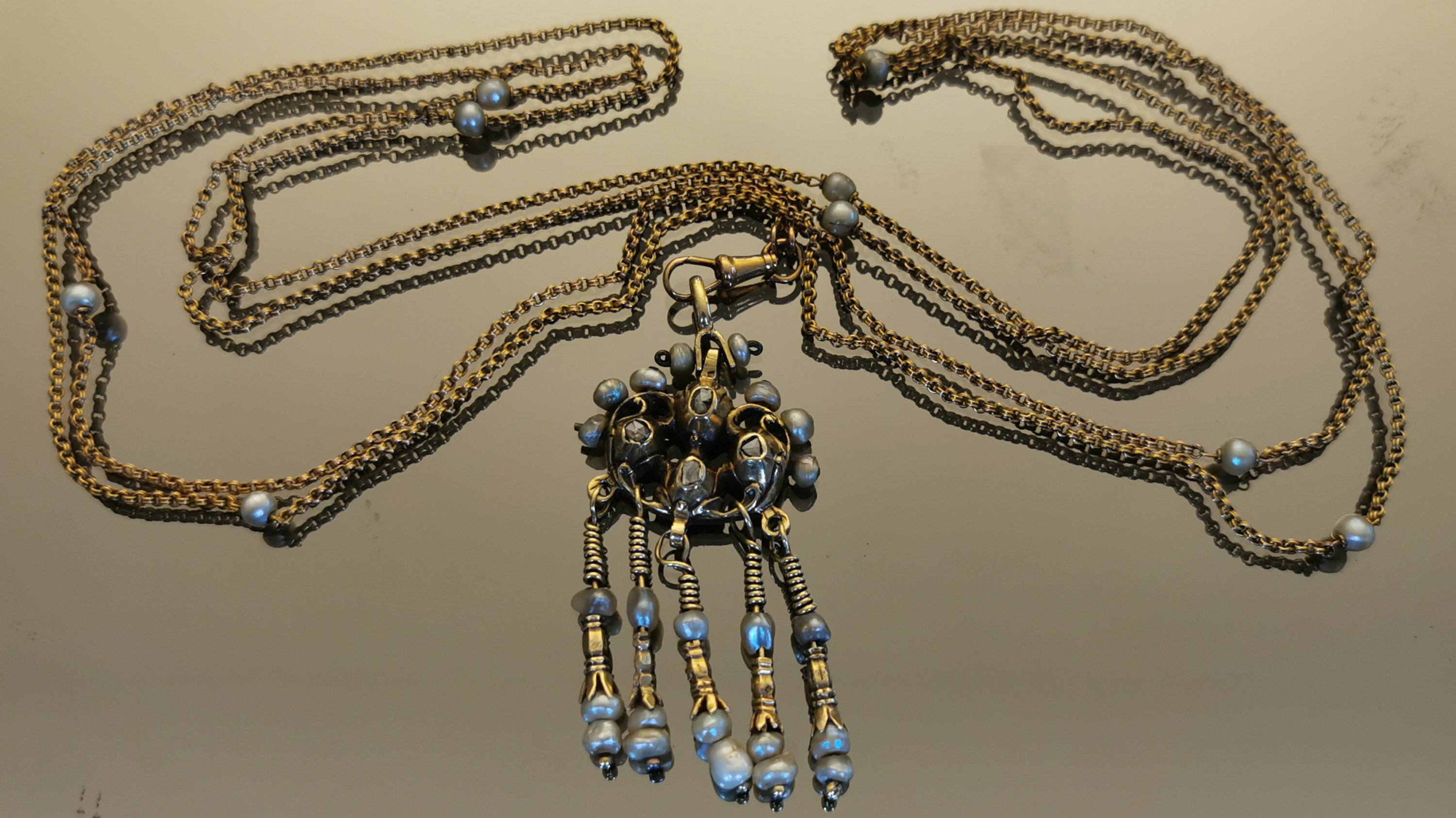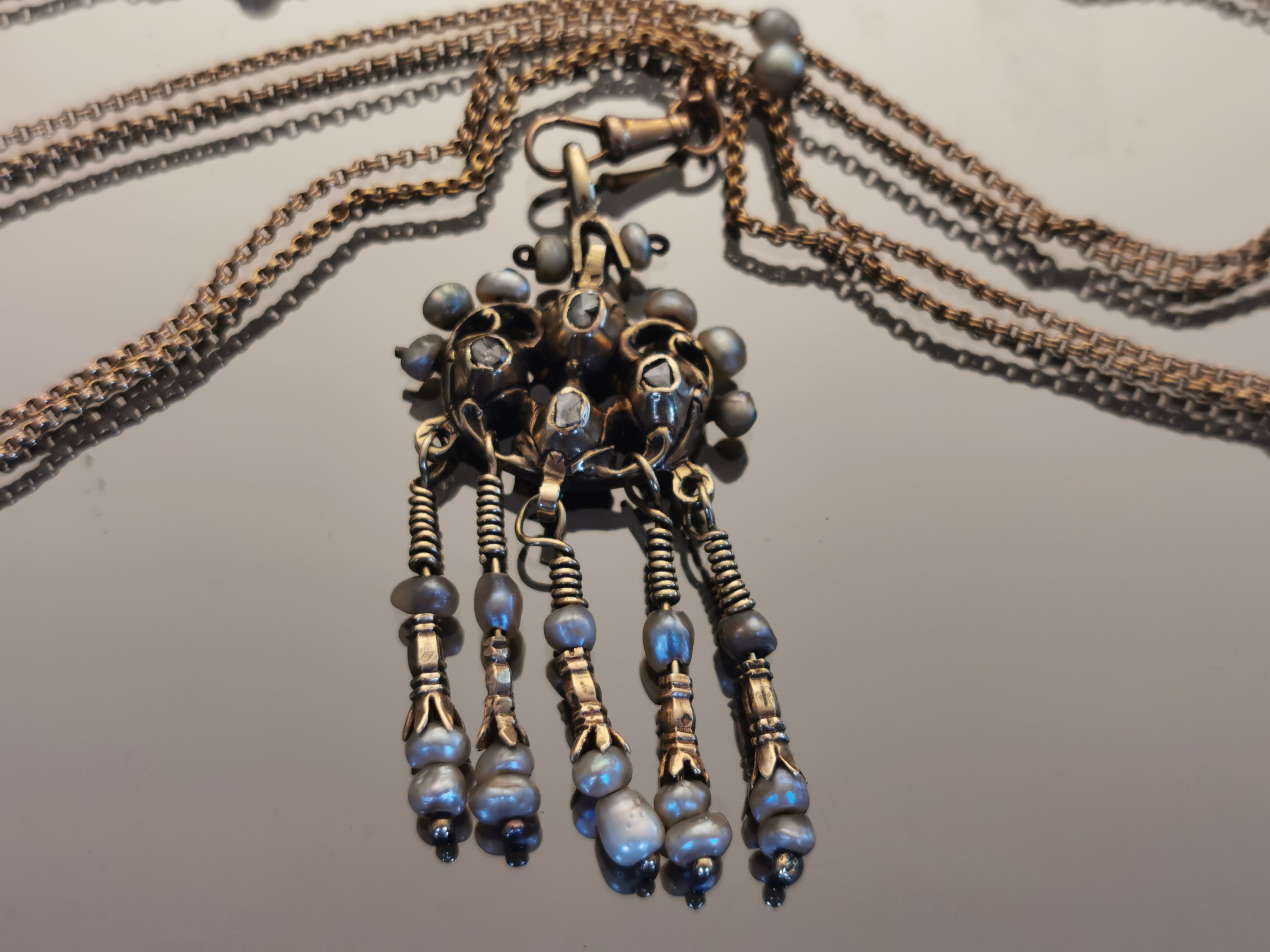 PENDENTIF et une CHAINE en or jaune 750 millièmes à décor de motifs floraux et croisillons surmonté de huit perles et se terminant par cinq colonnettes composées chacune de trois perles. La chaîne à alternance de maille et perles.