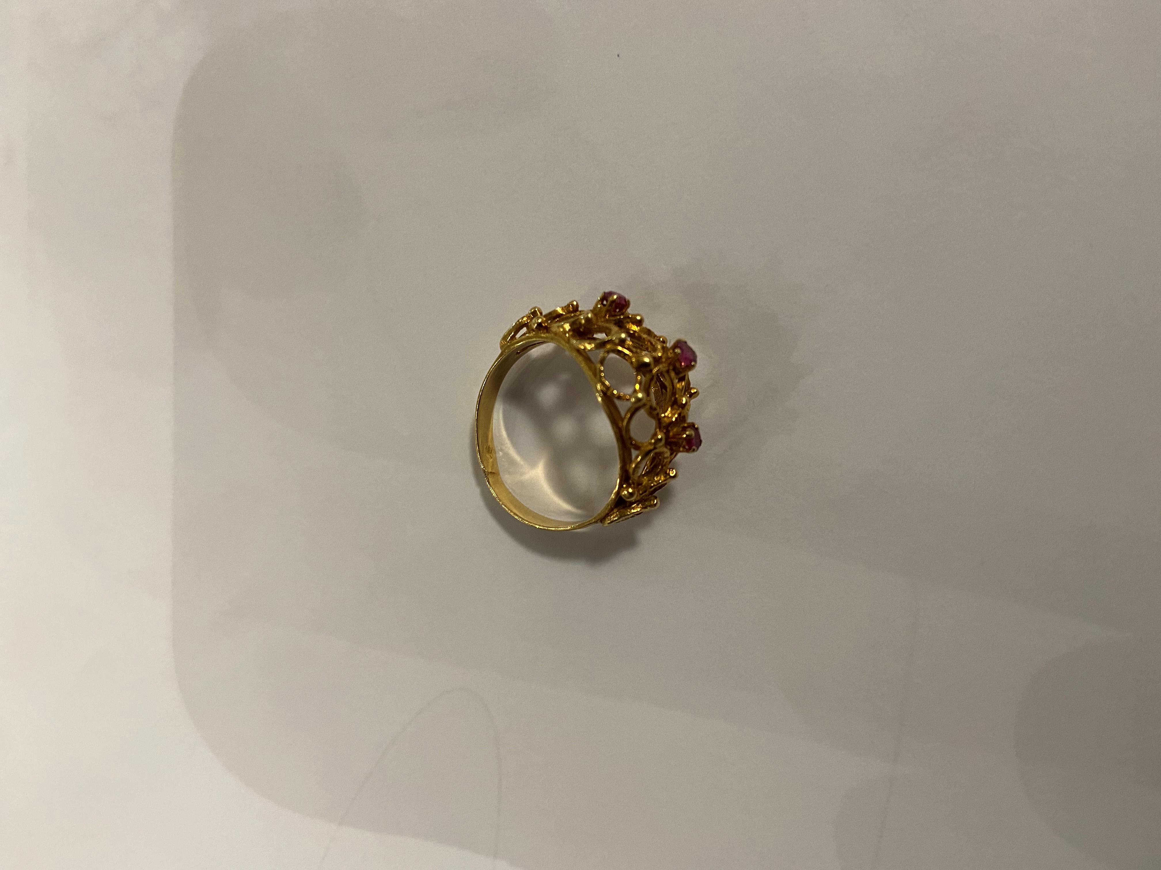 BAGUE en or jaune 750 millièmes ornée de trois petites pierres roses.