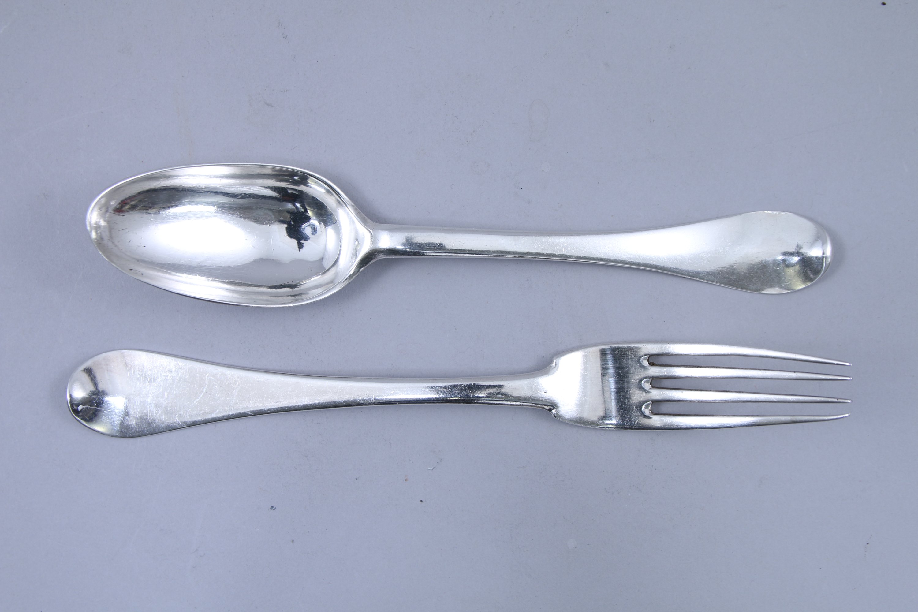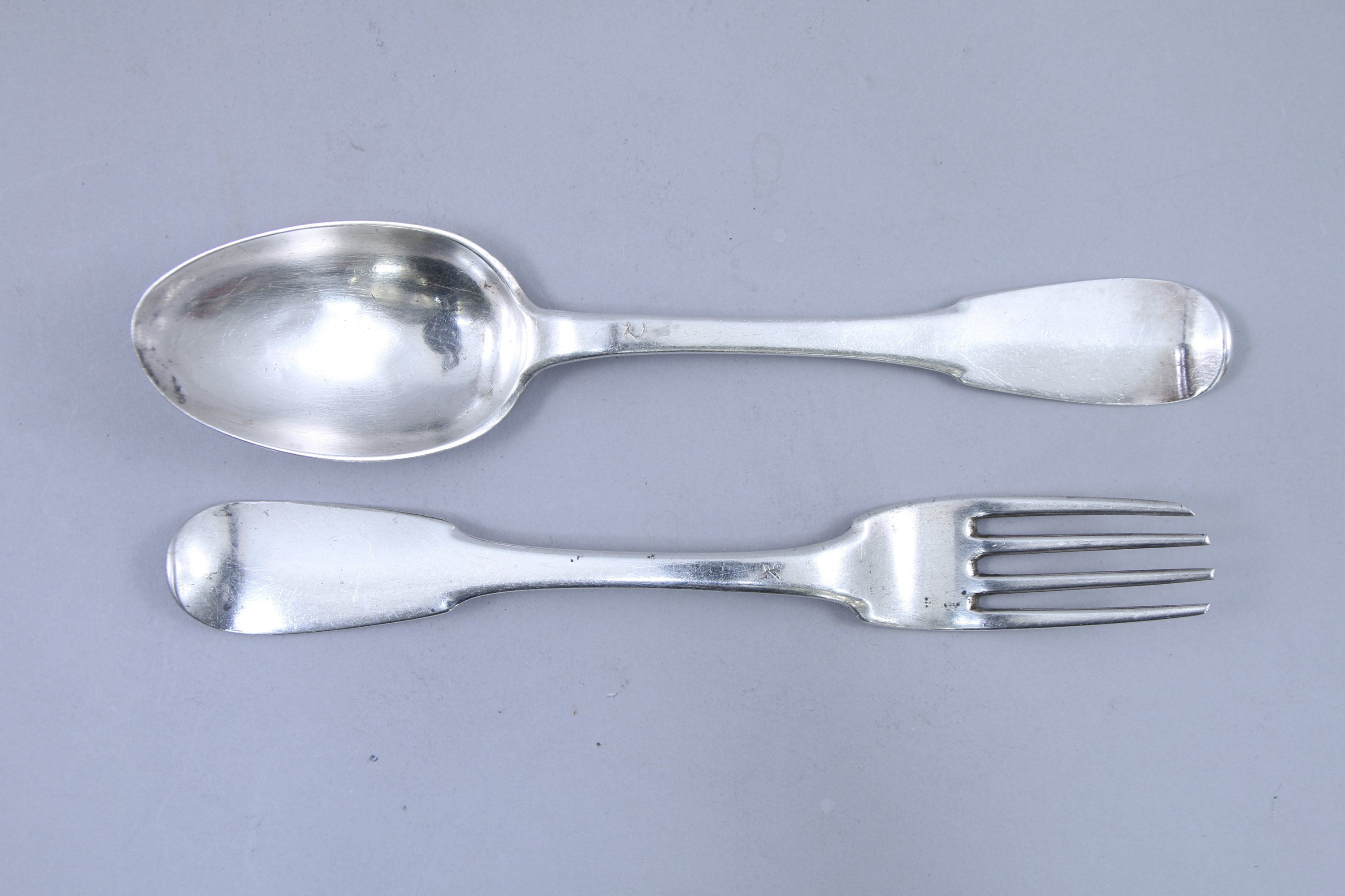 Un COUVERT, une FOURCHETTE et une CUILLER en argent modèle uniplat. Le couvert portant les initiales "G.M.".