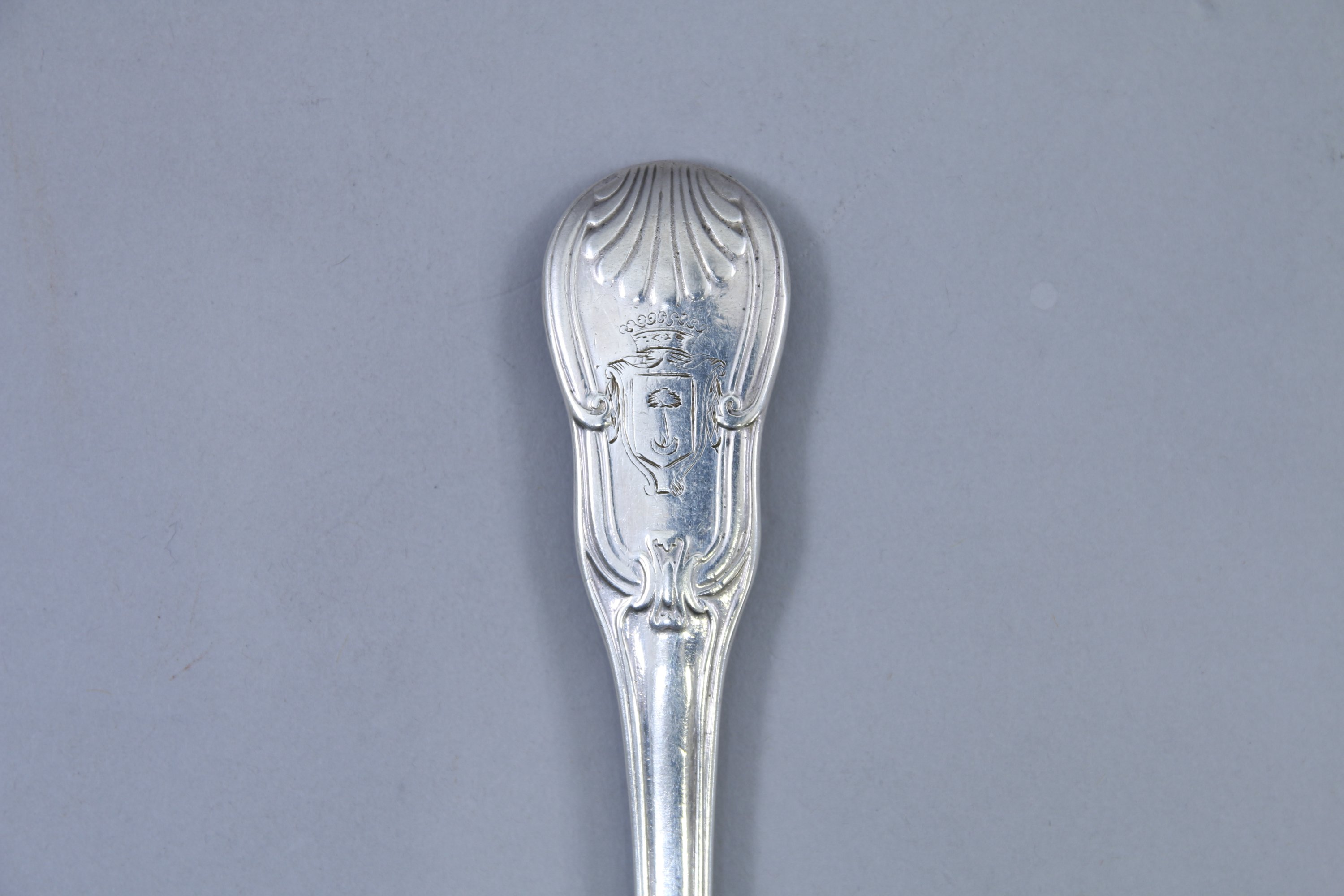 Cinq FOURCHETTES de TABLE en argent, modèle violon coquille, gravées d'armes à la couronne comtale (partiellement effacées).