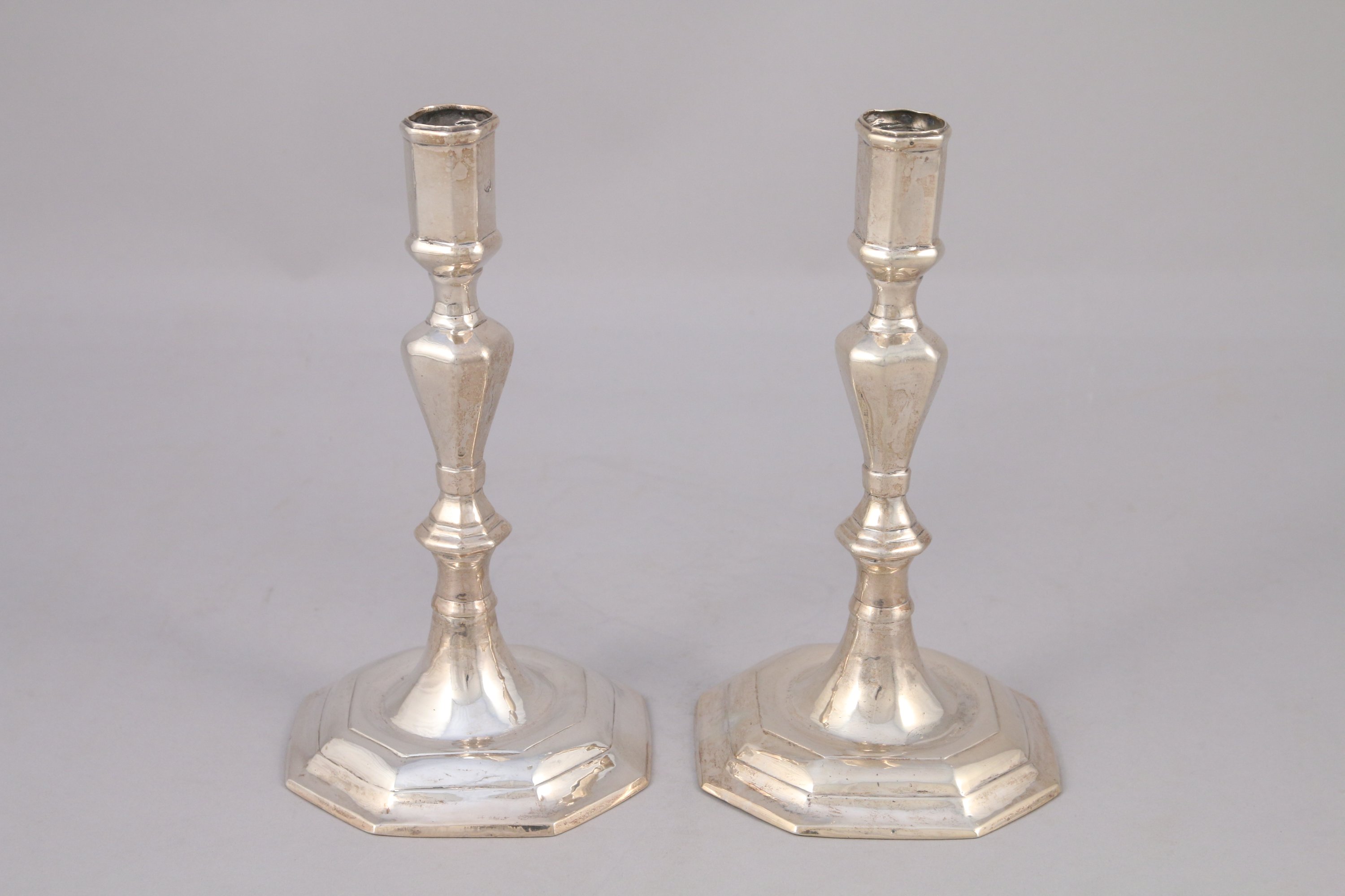 PAIRE de FLAMBEAUX en argent. Fût balustre à pans coupés, base à doucine à huit pans.