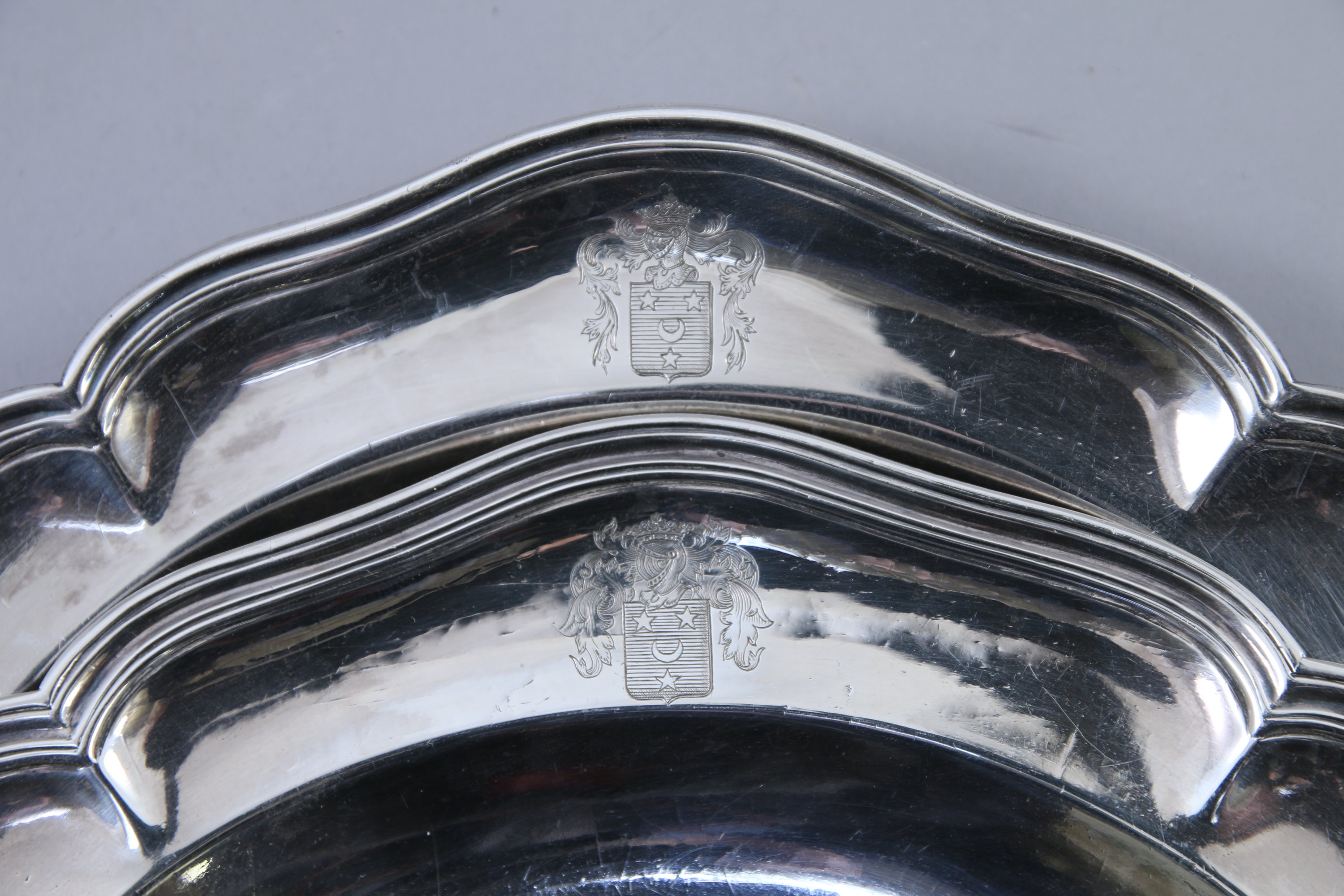 Paire de PLATS en argent. Modèle à double filets et bords contournés. Gravés d'armes surmontées d'un heaume à la couronne marquisale.