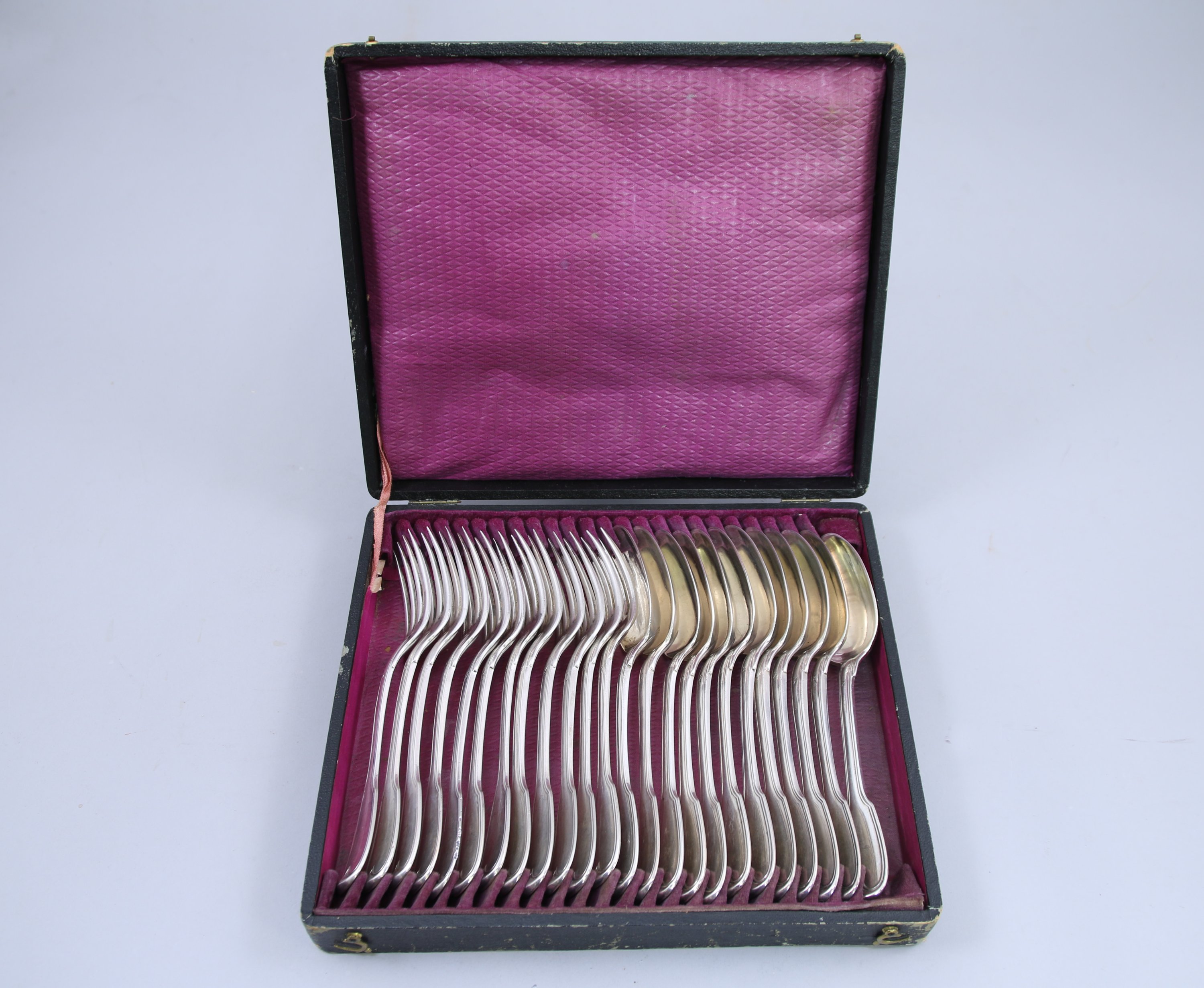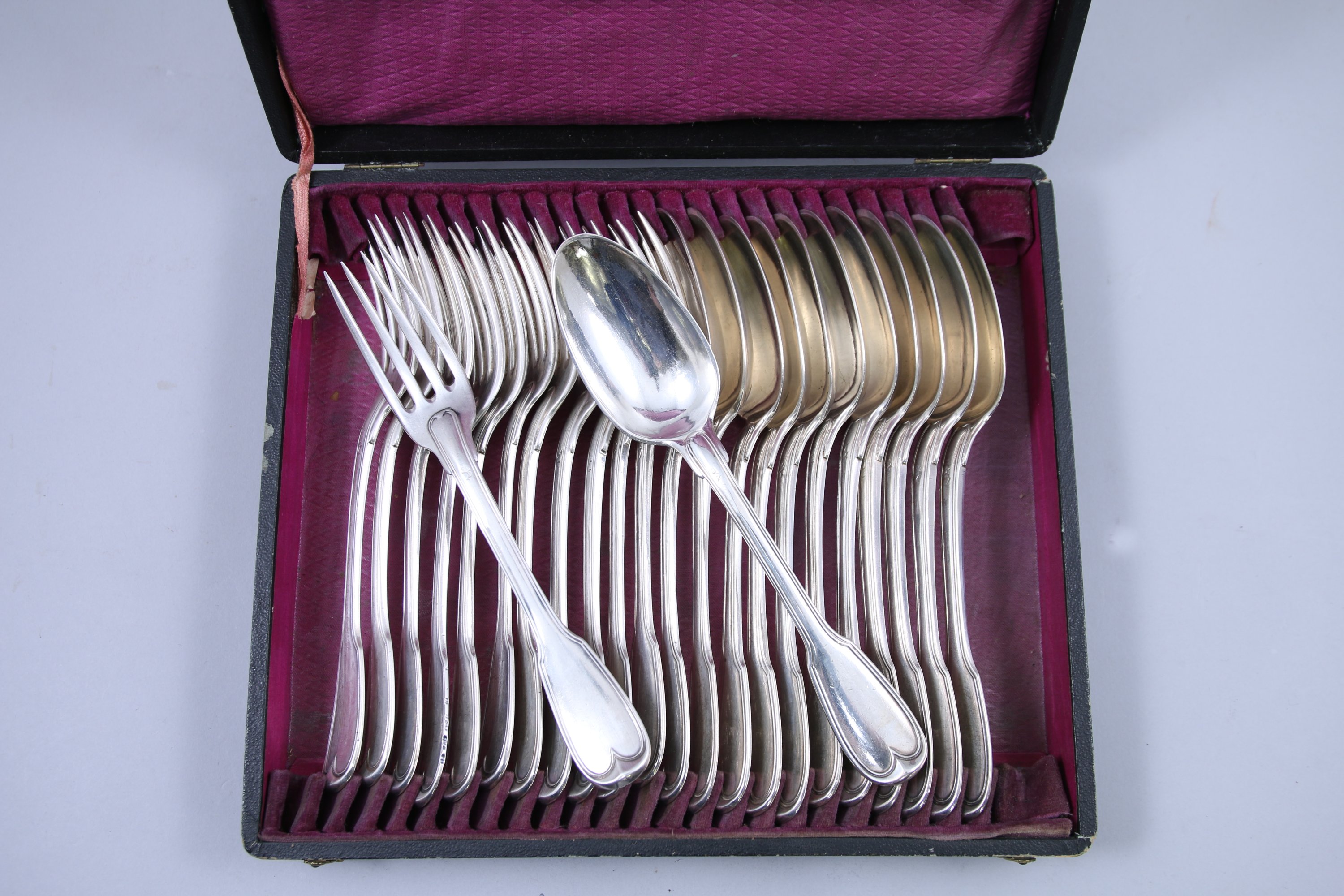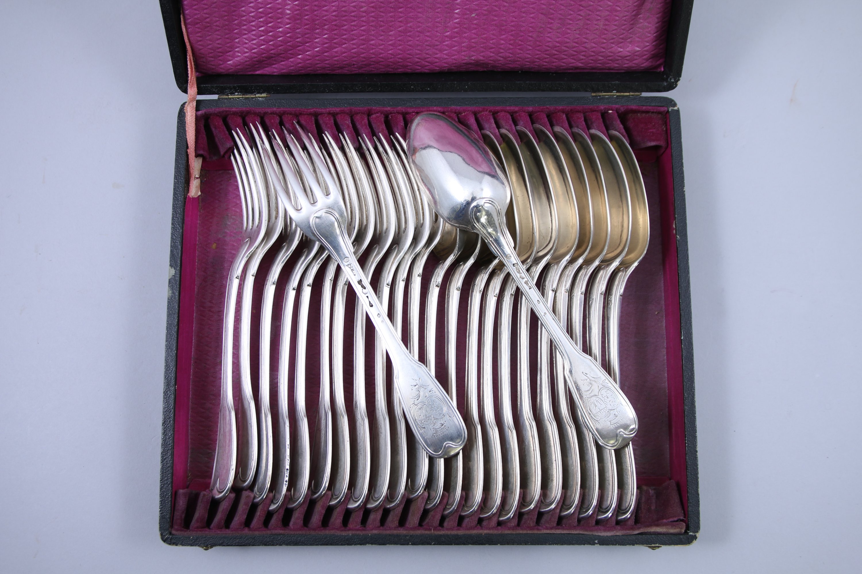 Douze COUVERTS de TABLE en argent modèle filet, aux armes alliances coiffées d'une couronne comtale.