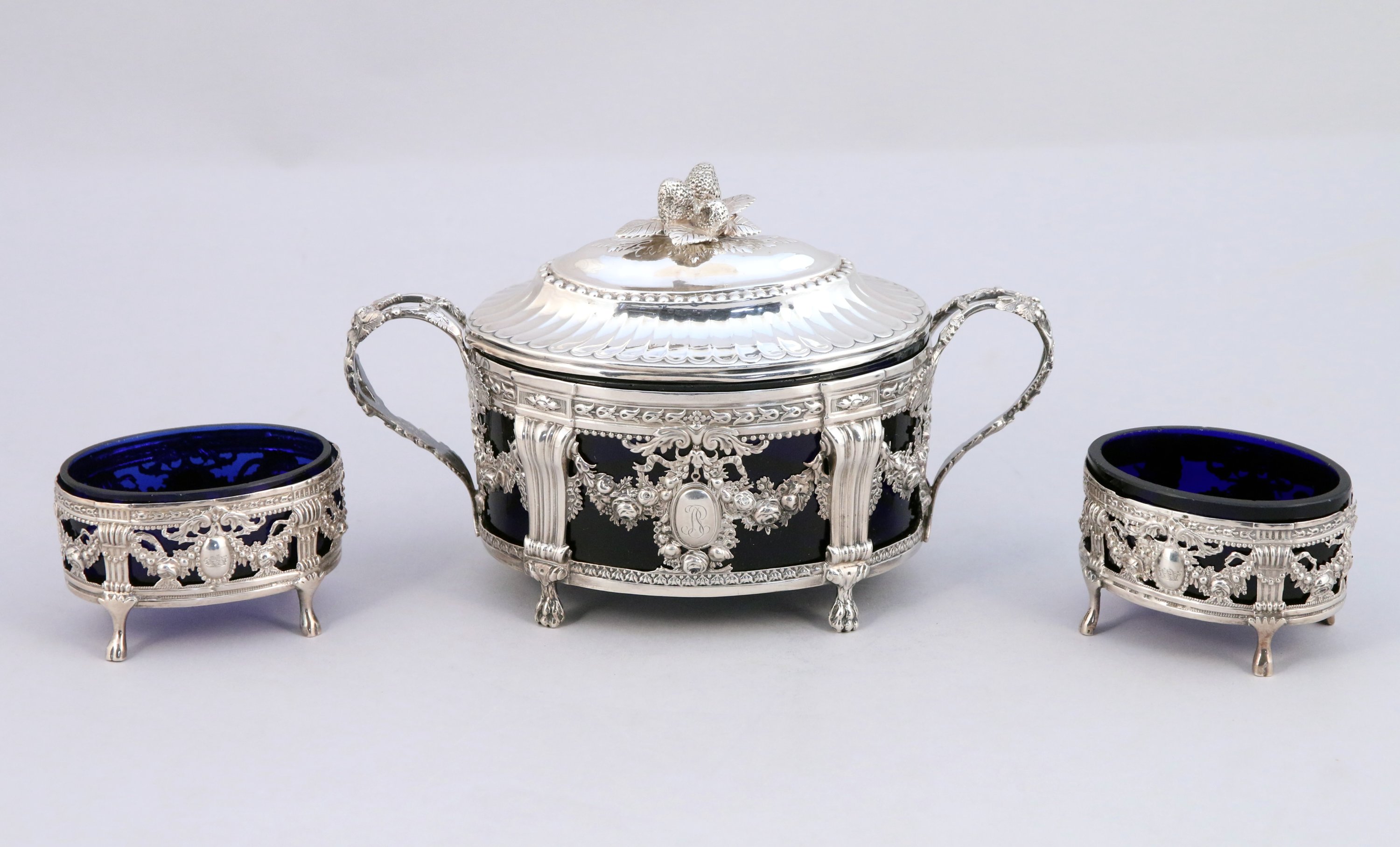 SUCRIER couvert en argent, le dessus présentant un fretel à graines sur une terrasse de six feuilles entourée d'un rang de perles surmontant un décor de godrons. Deux anses à motifs de pampres de vigne. La panse composée de pilastres reliés par des guirlandes fleuries entourant au centre un médaillon au chiffre "AR". Repose sur quatre pieds griffes.