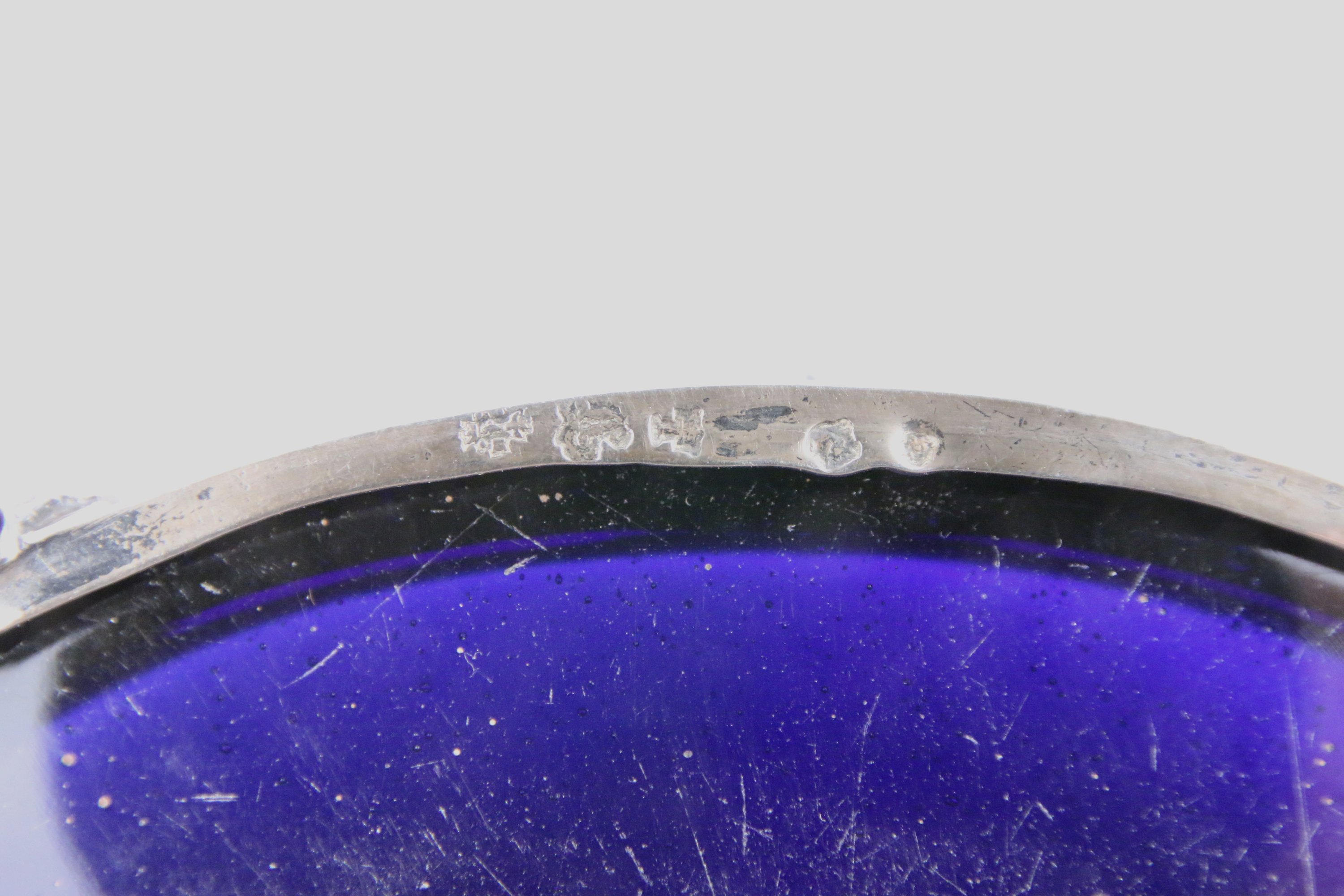 JOINT : Deux SALERONS en argent à décor de pilastres et guirlandes fleuries. Poinçons des fermiers généraux. Intérieur en verre bleu. Poids brut : 250 g. Haut. 3, Long. 6 cm.