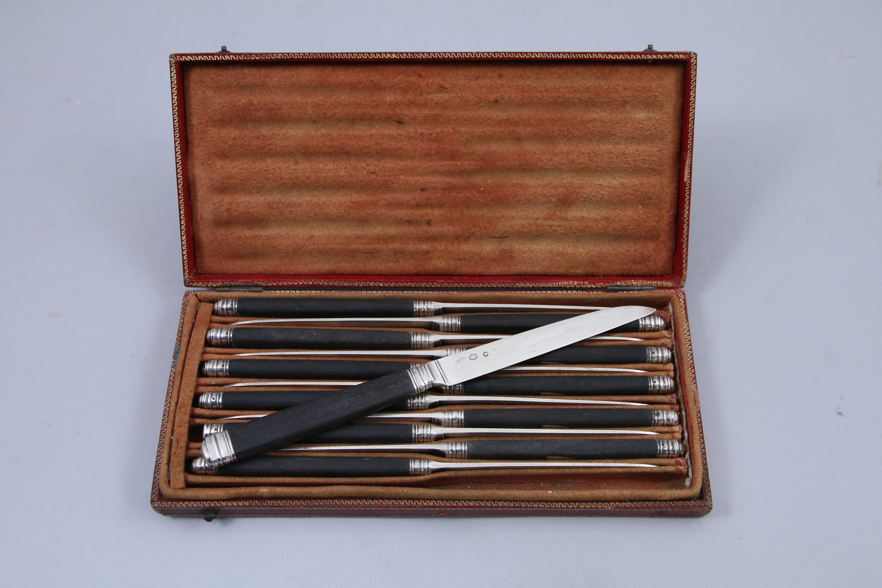Douze COUTEAUX à dessert en argent et bois noirci. Poinçon...