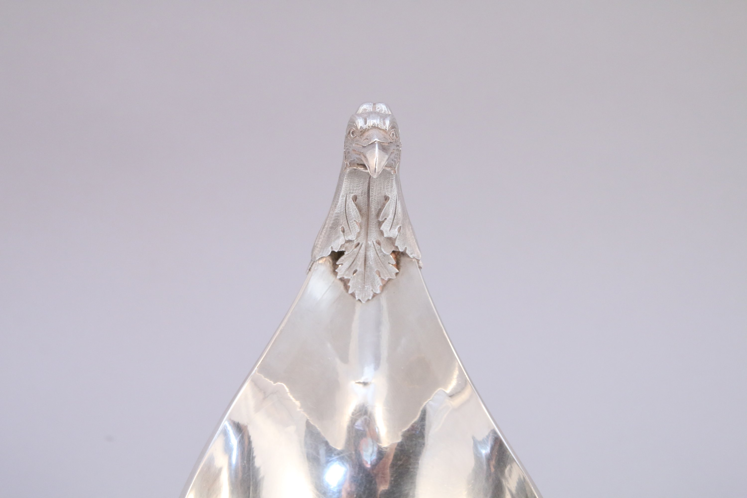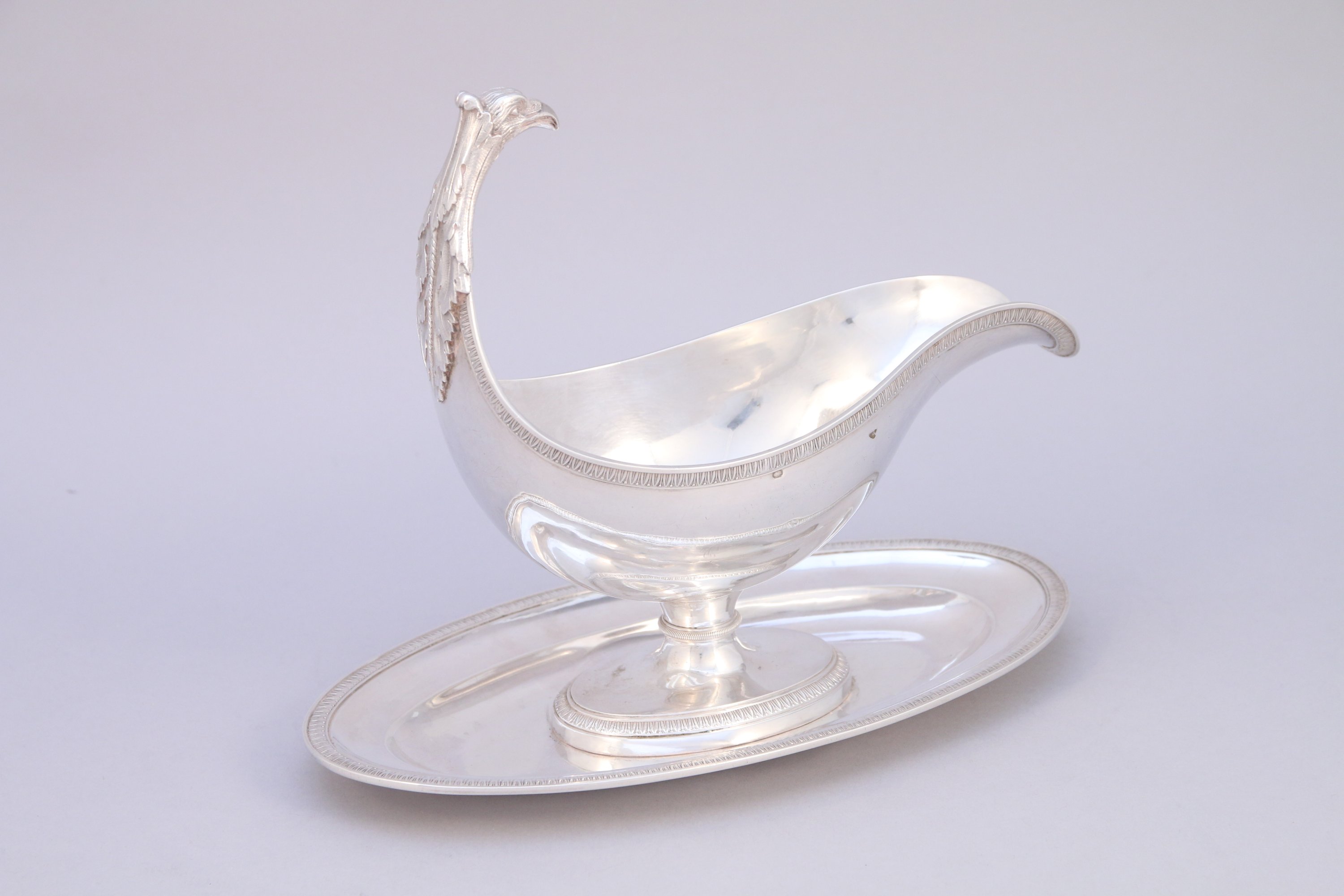 SAUCIÈRE casque à plateau adhérant en argent, l'anse à décor d'une tête d'aigle se terminant sur la panse par une feuille d'acanthe. Les bordures sont ornées d'une frise de feuilles d'eau. Chiffré sur la panse et le plateau "LC".