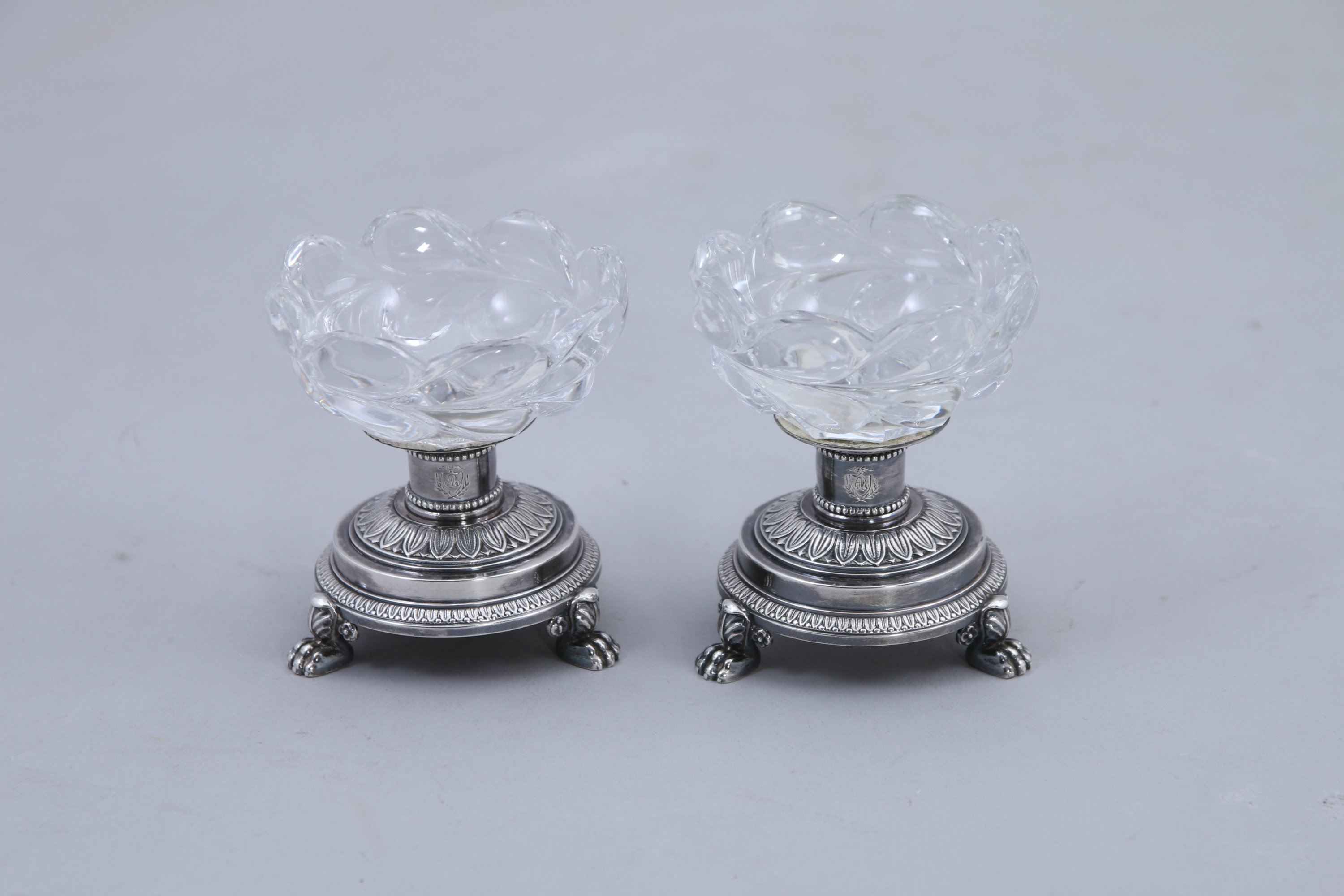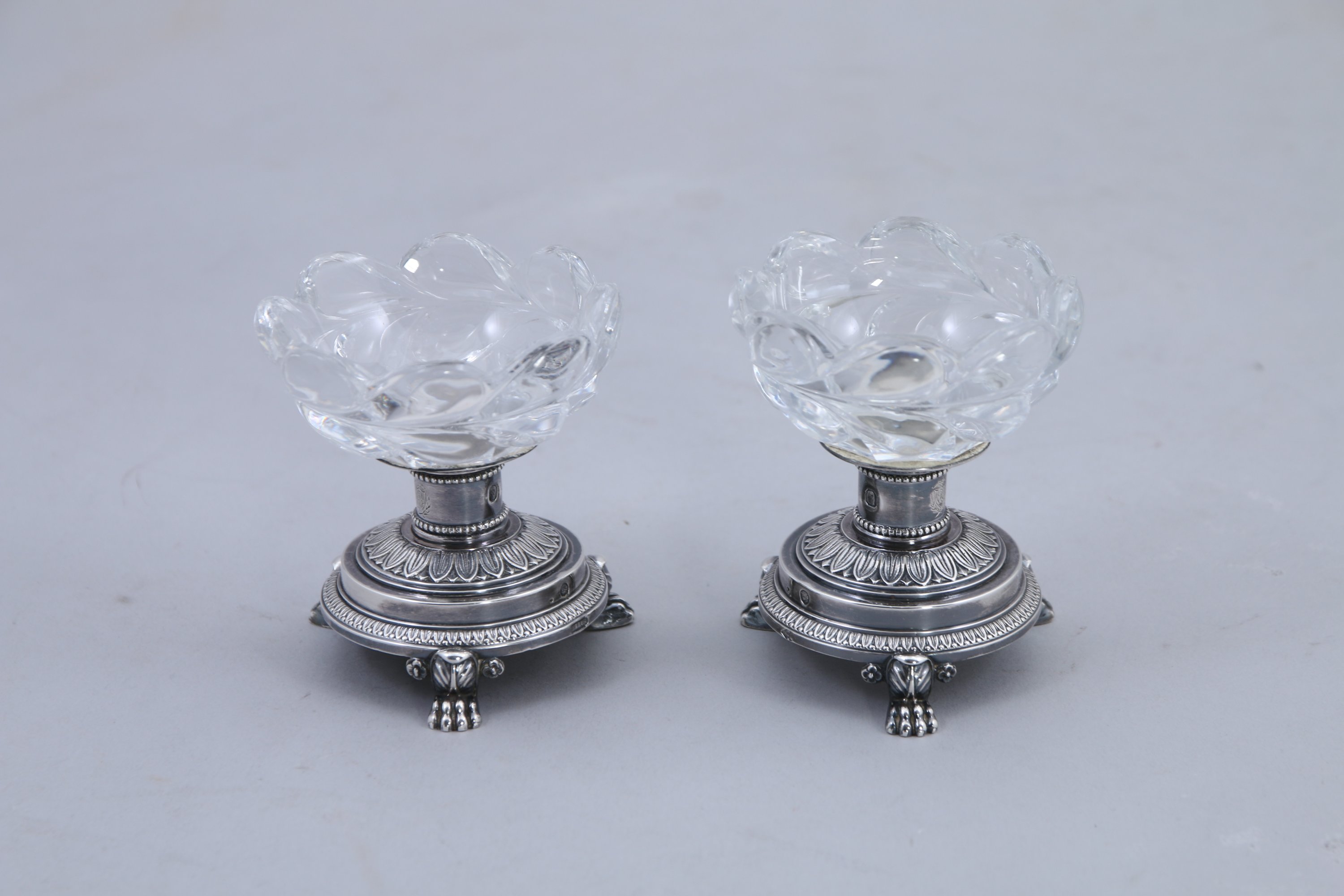 SALIÈRE et POIVRIÈRE en cristal et argent. Le pied tripode se terminant en griffes de lion. Les réceptacles en formes de feuillage.