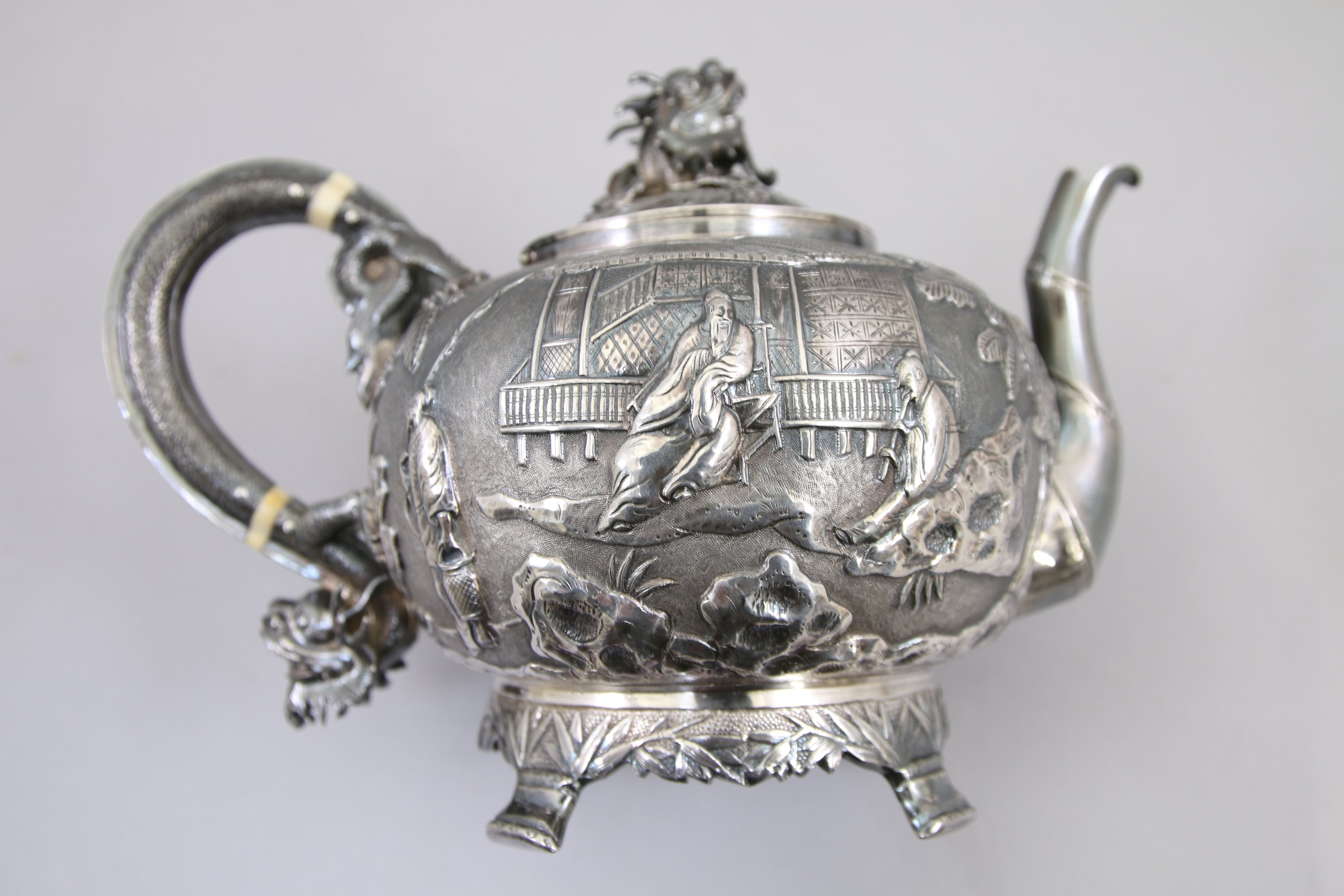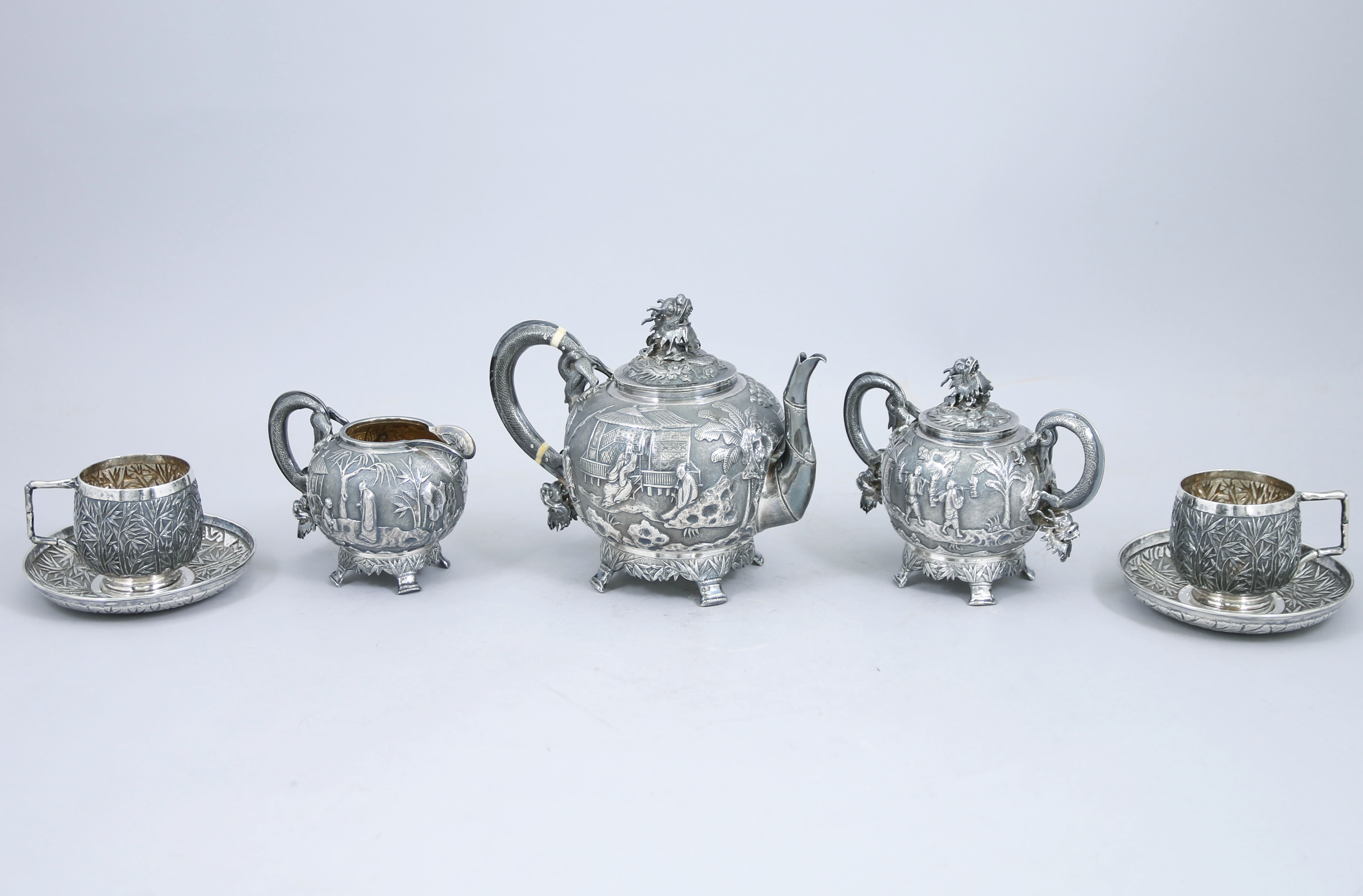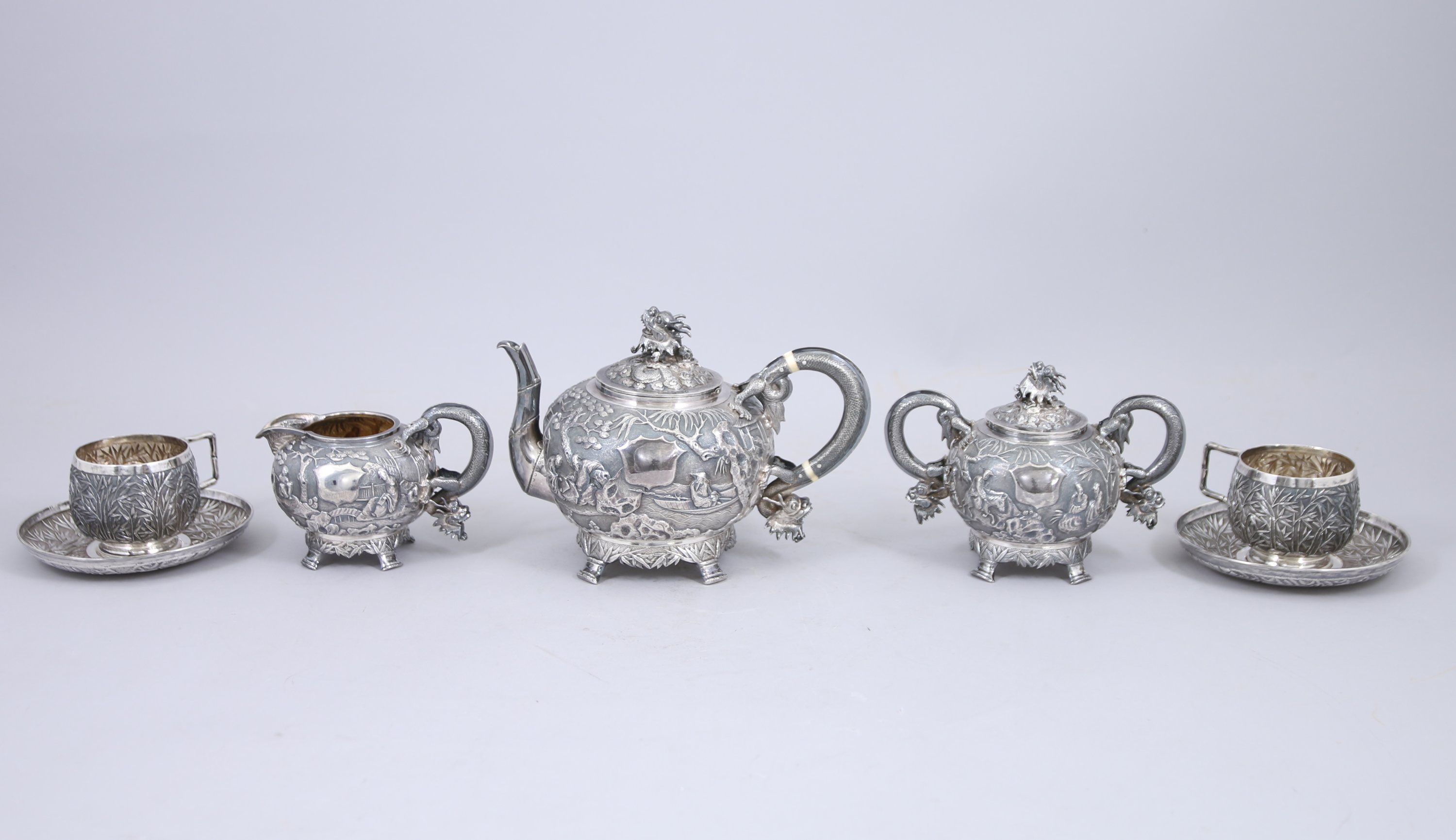 SERVICE à THÉ dit TÊTE à TÊTE en argent massif et ivoire comprenant une THÉIÈRE, un POT-À-LAIT, un SUCRIER, deux TASSES et leurs SOUS-TASSES. Riche décors en relief : prises et anses en forme de dragons, personnages dans des paysages, tels que joueurs du jeu de go, pêcheurs, musiciens, porteur de fagots, penseurs