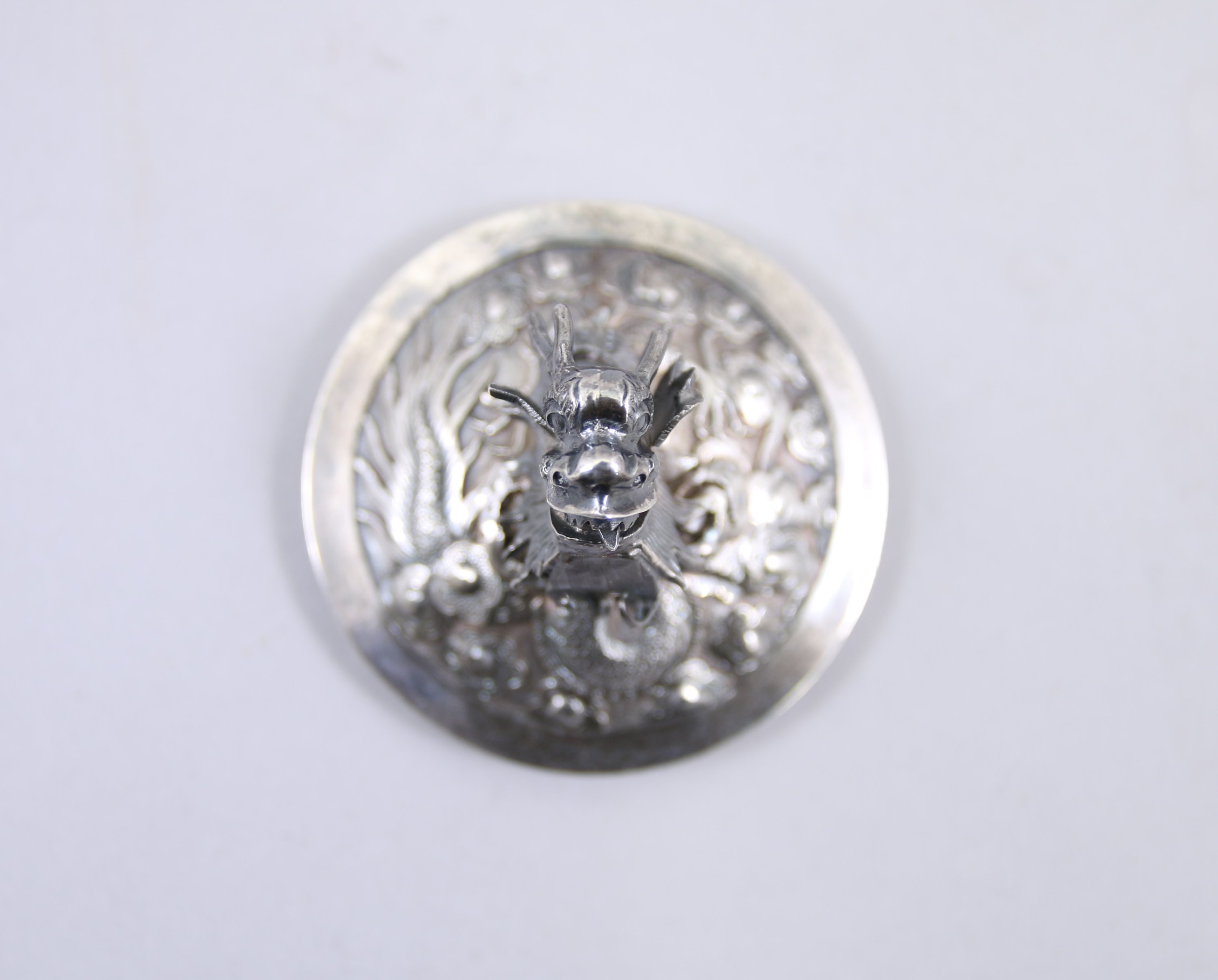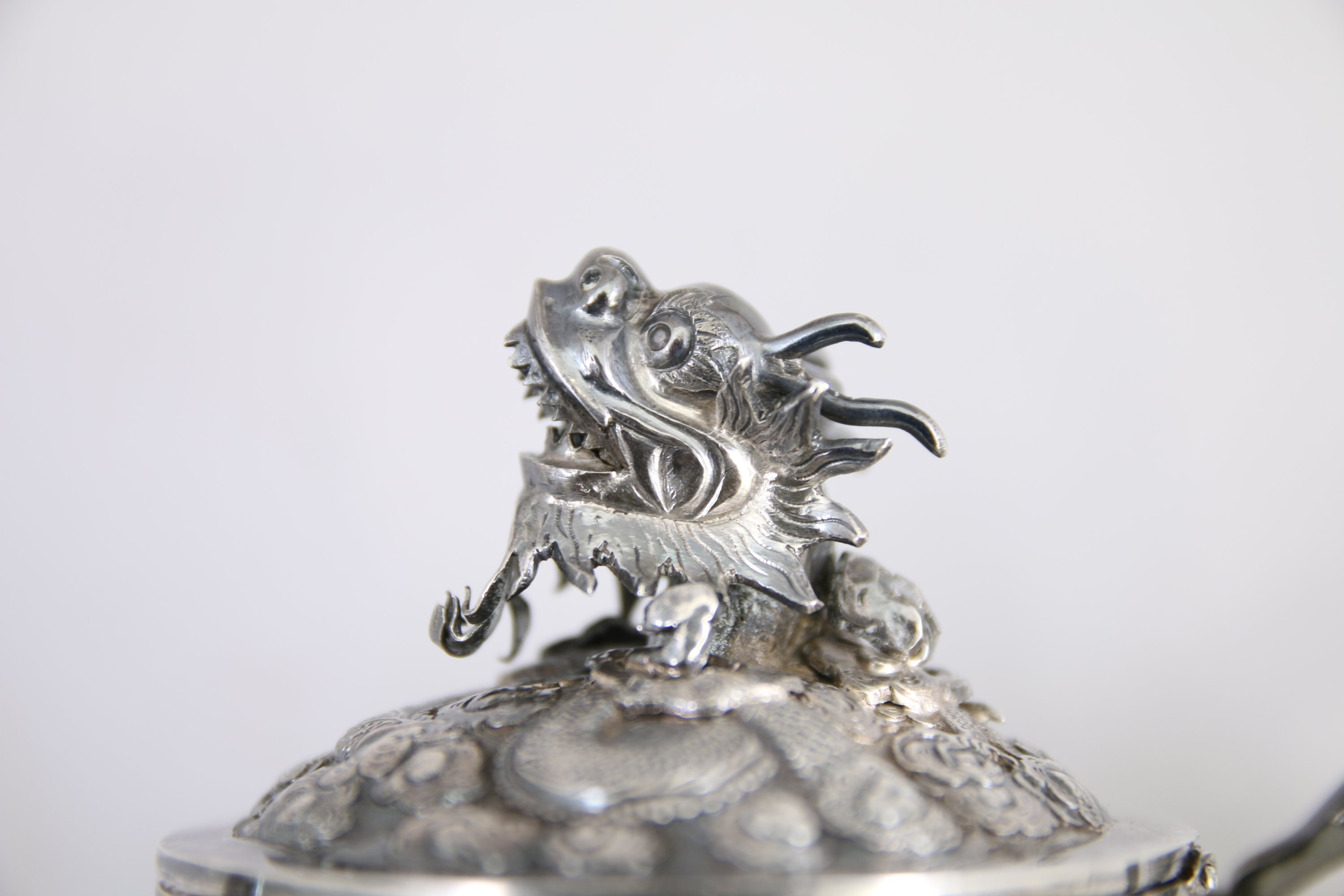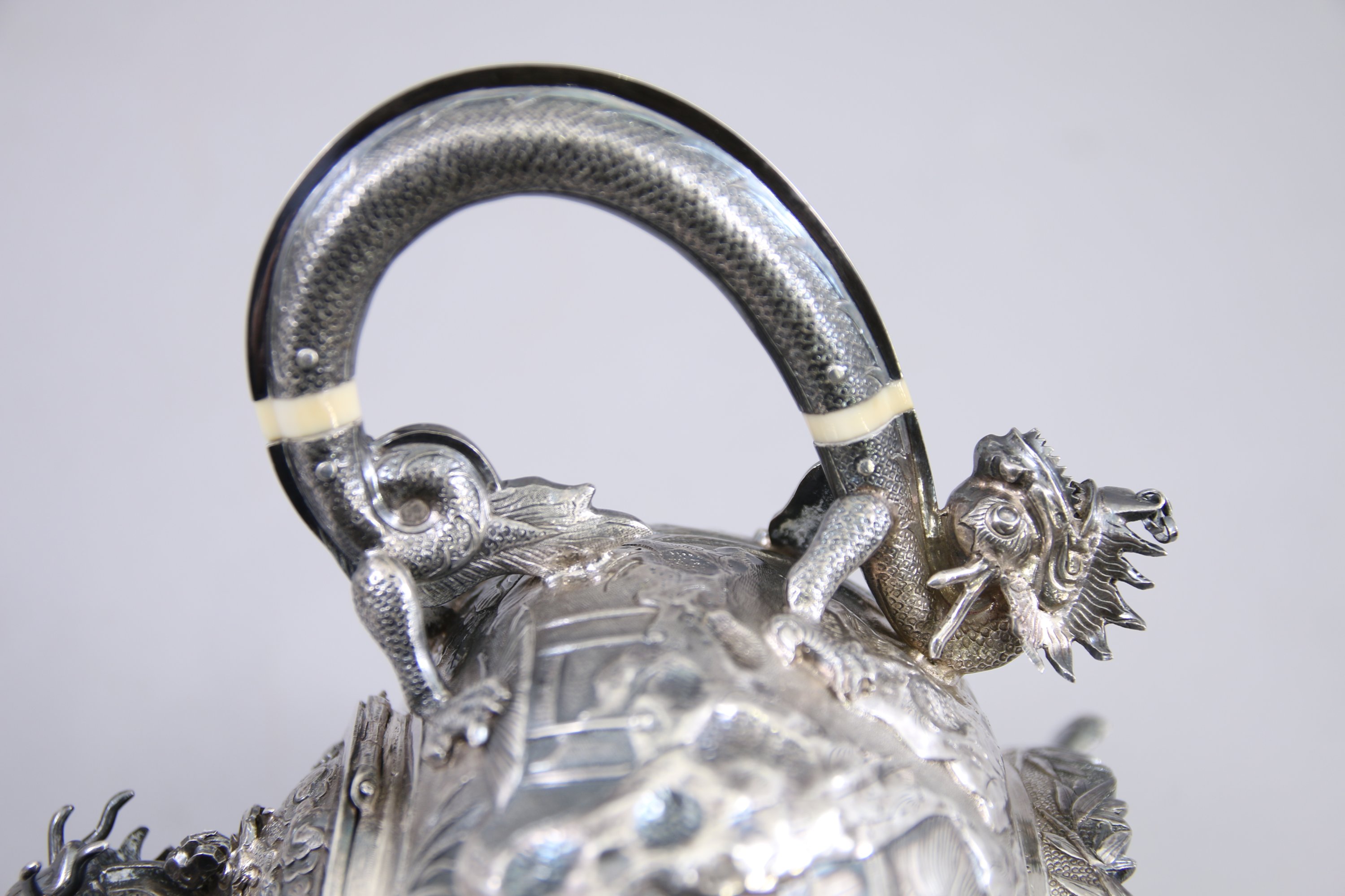 SERVICE à THÉ dit TÊTE à TÊTE en argent massif et ivoire comprenant une THÉIÈRE, un POT-À-LAIT, un SUCRIER, deux TASSES et leurs SOUS-TASSES. Riche décors en relief : prises et anses en forme de dragons, personnages dans des paysages, tels que joueurs du jeu de go, pêcheurs, musiciens, porteur de fagots, penseurs
