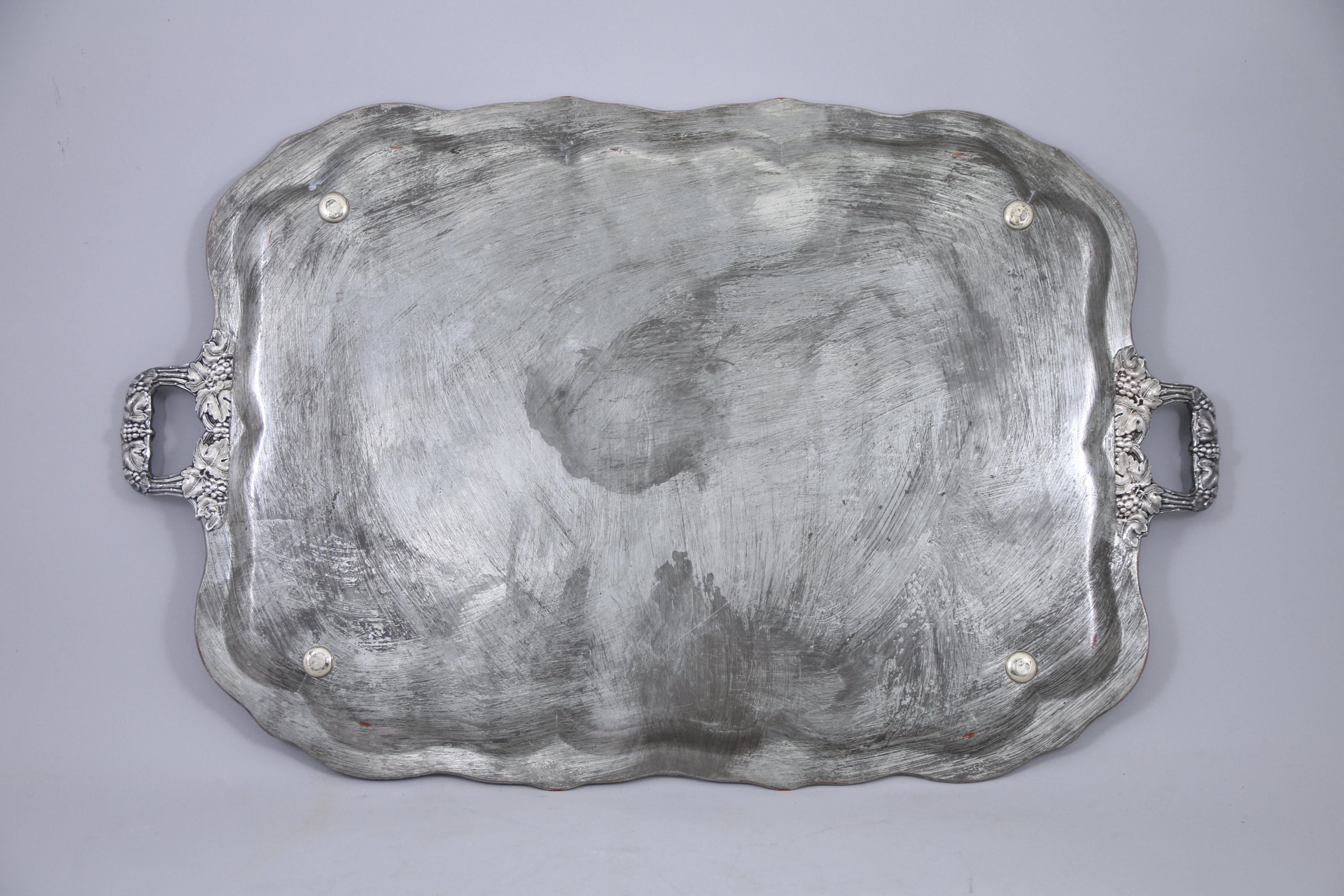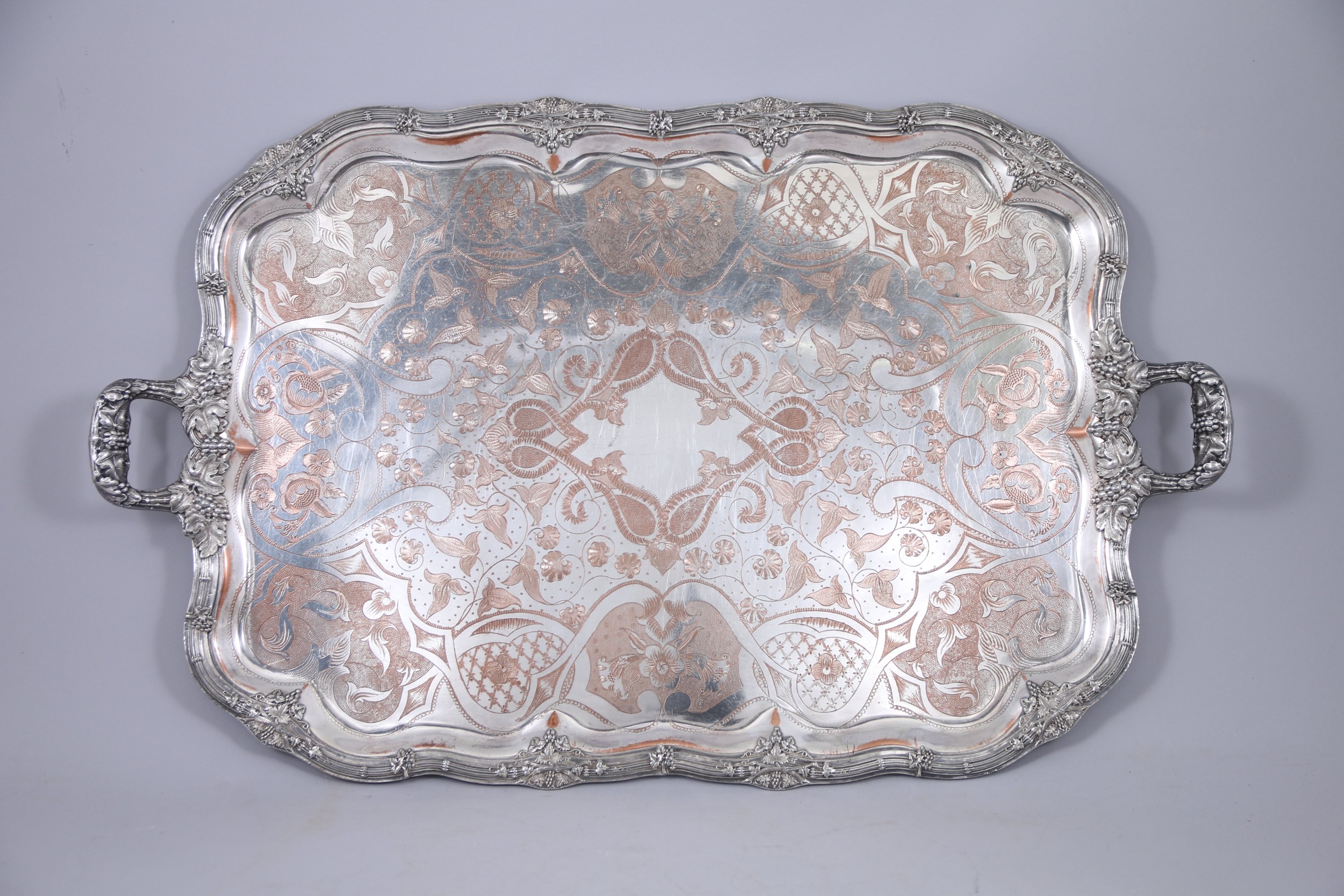 JOINT : Grand PLATEAU de SERVICE en cuivre argenté de forme chantournée, aux élégants motifs de pampres et feuilles de vigne sur les anses et le long de la bordure. Le fond gravé de fleurs dhibiscus. Long. 76, Larg. 48 cm. Bagues