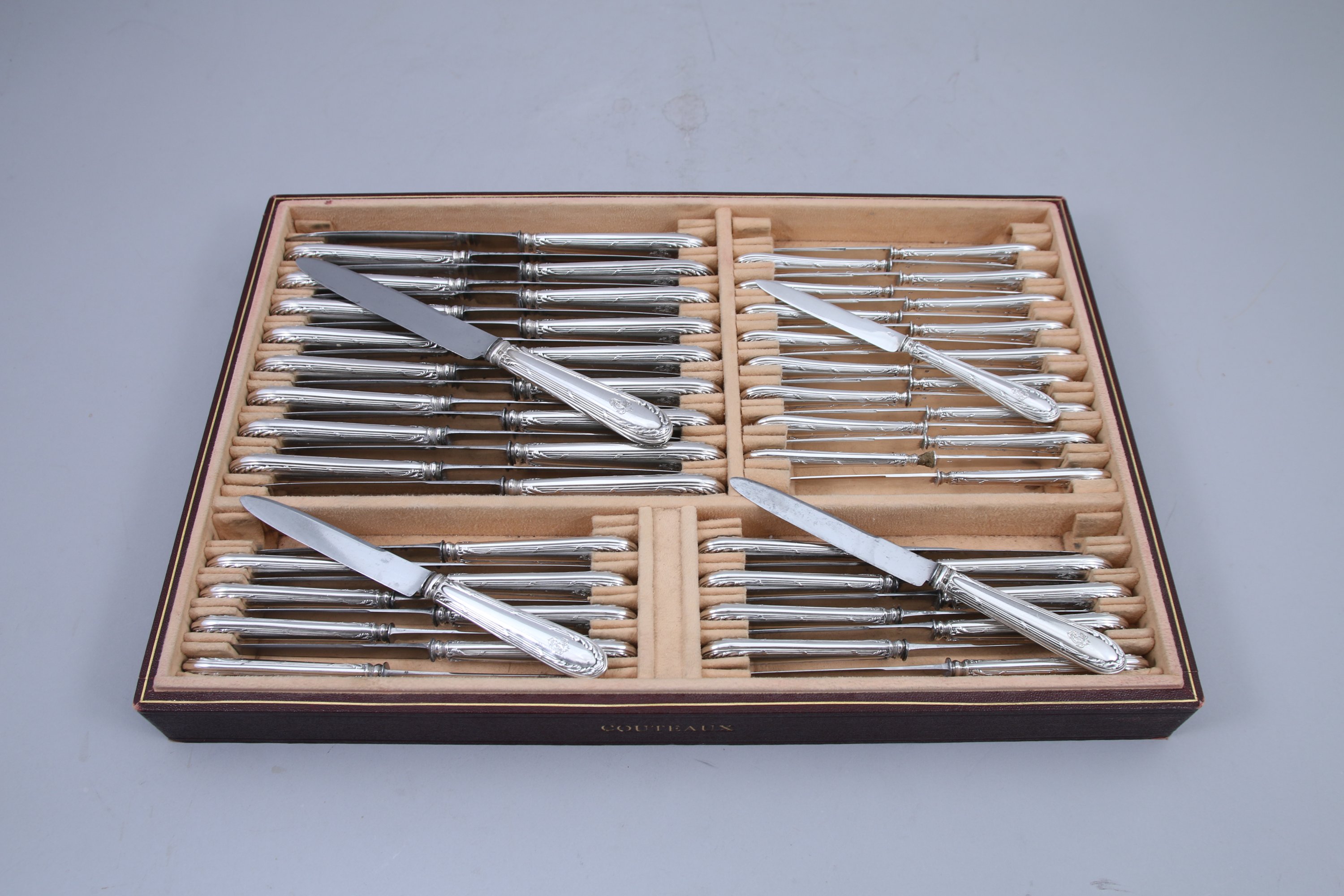- DIX-HUIT COUTEAUX de TABLE manche en argent fourré, lame acier. Poids brut 1.290 g.