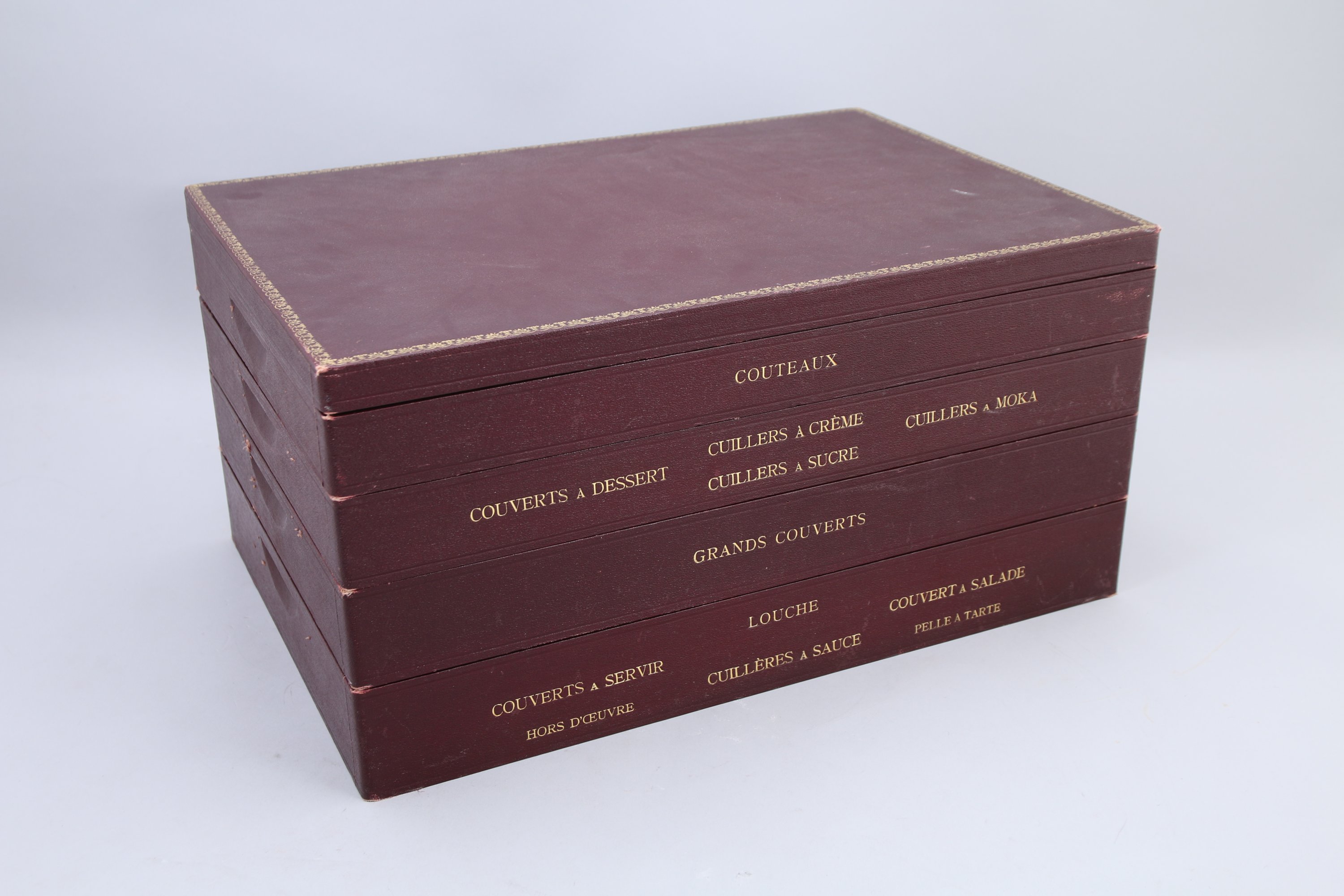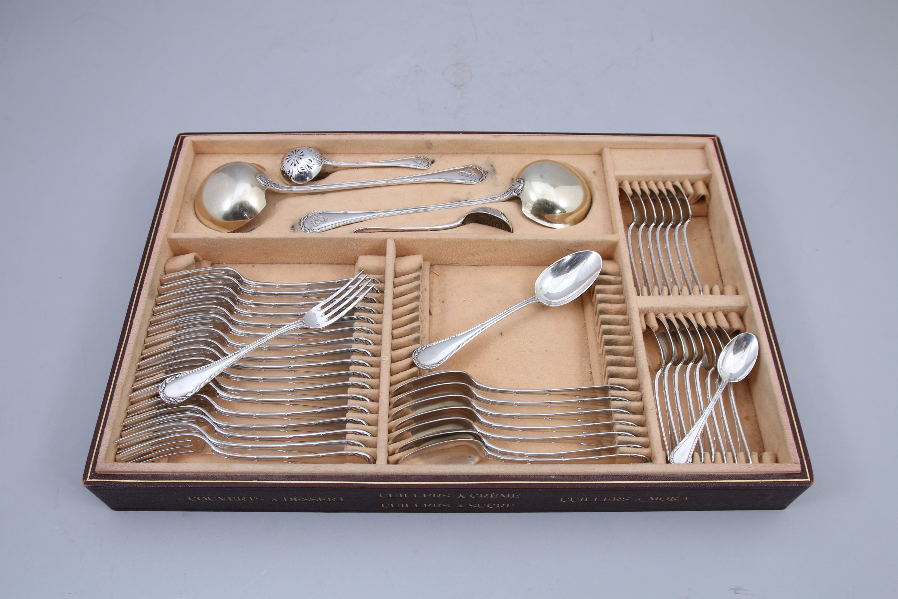 PUIFORCAT. MÉNAGÈRE de CENT SOIXANTE-TREIZE pièces en argent modèle filets rubans aux feuilles d'acanthes, chaque élément chiffré "CR". Deux pièces en vermeil. Comprenant :