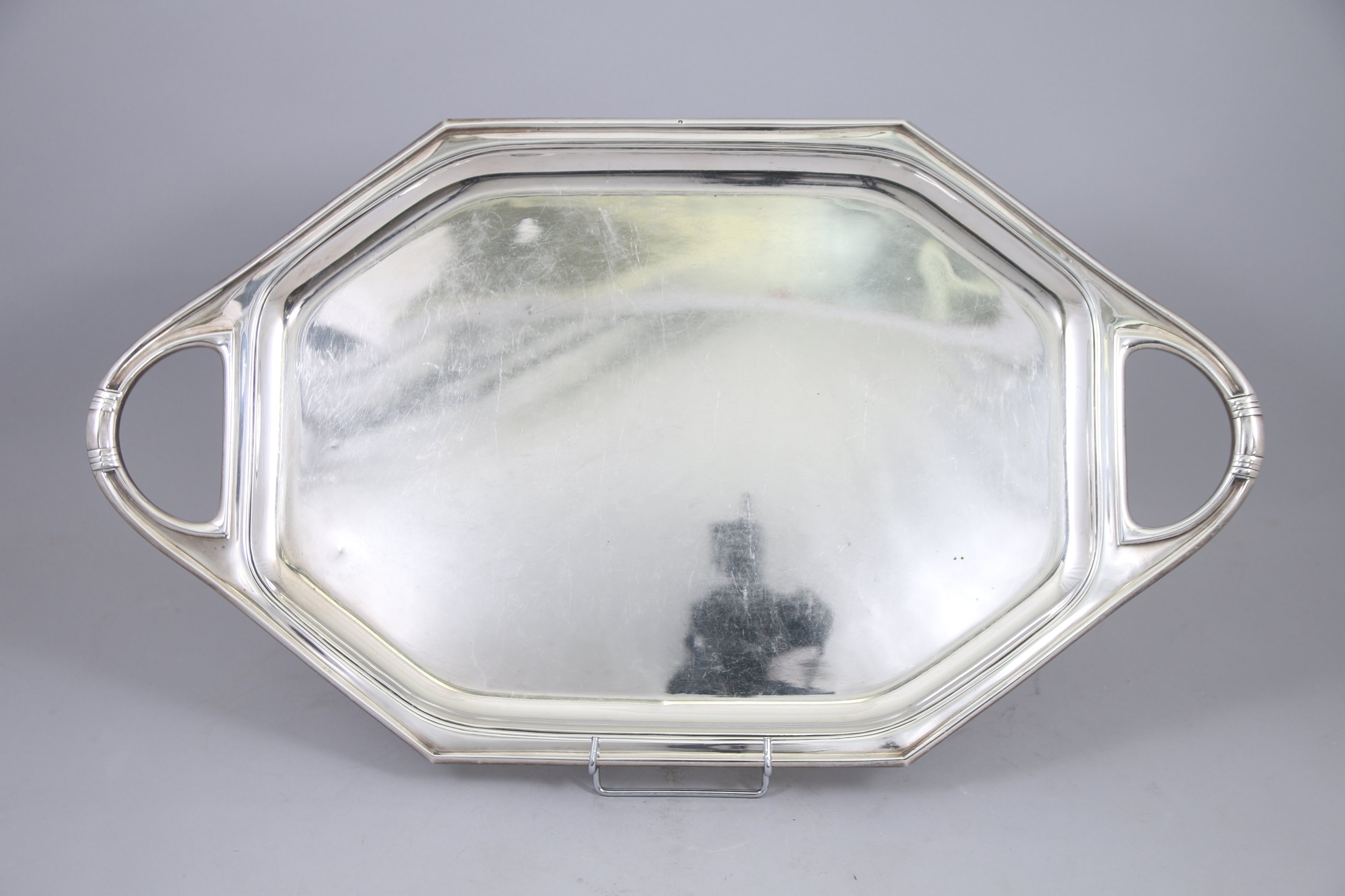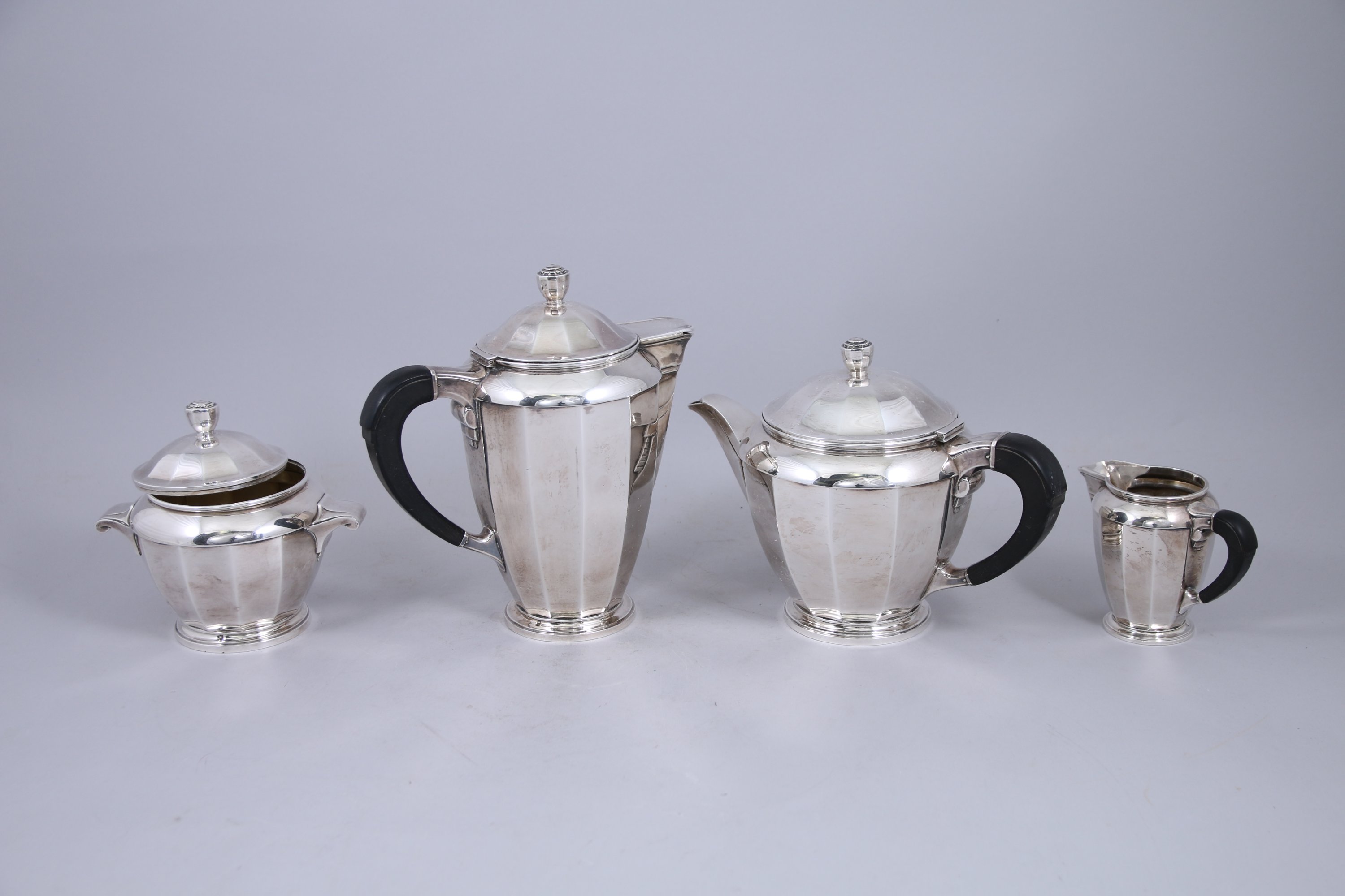 SERVICE à THÉ et CAFÉ ART DÉCO en argent cinq pièces comprenant un PLATEAU à ANSES, un POT à LAIT, une CAFETIÈRE, une THÉIÈRE et un SUCRIER couvert. Anse en bois exotique, ébène ? Modèle à pans coupés.