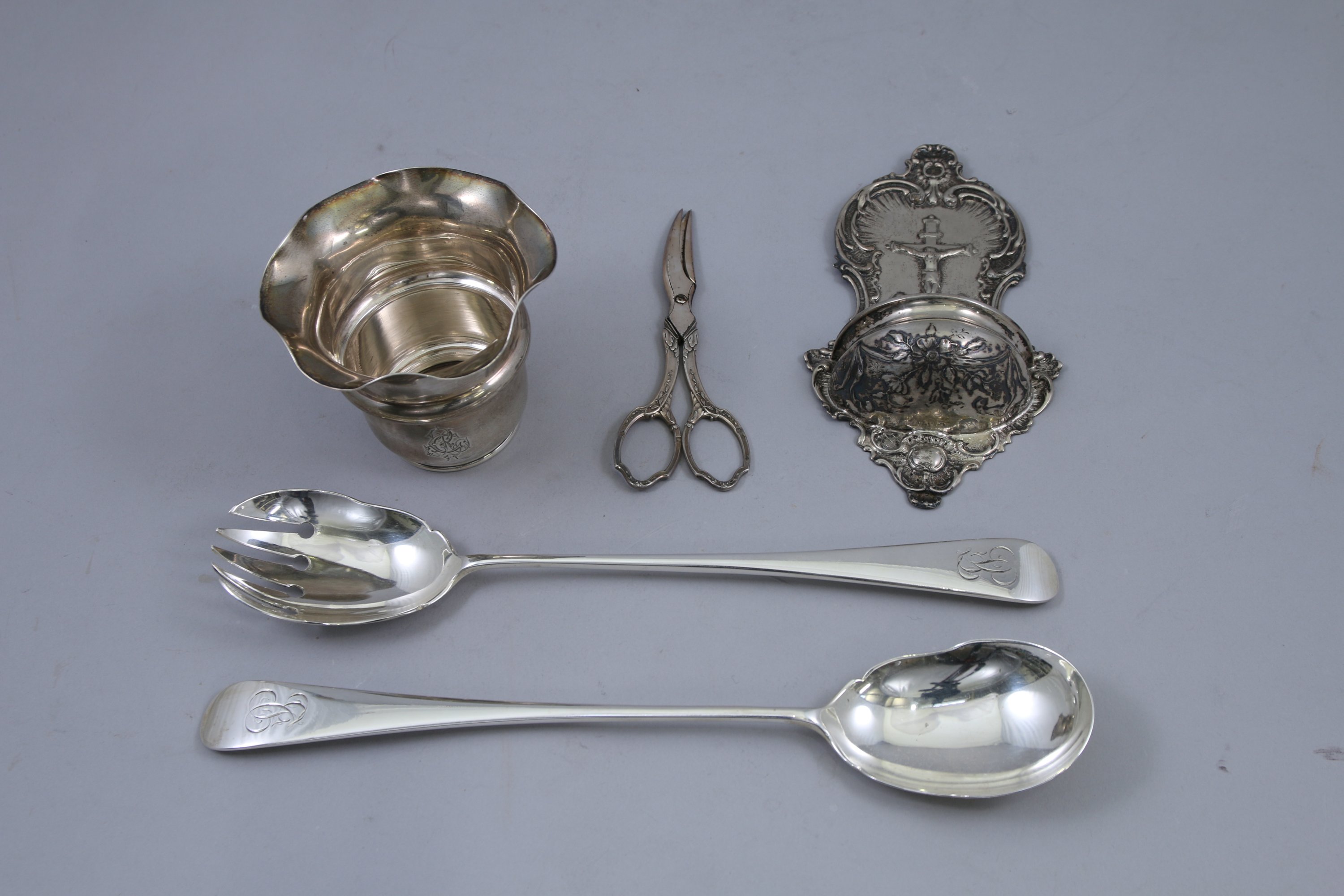 - COUVERTS de SERVICE modèle uniplat, chiffrés "F.G". Poinçons étrangers. Poids 235 g.