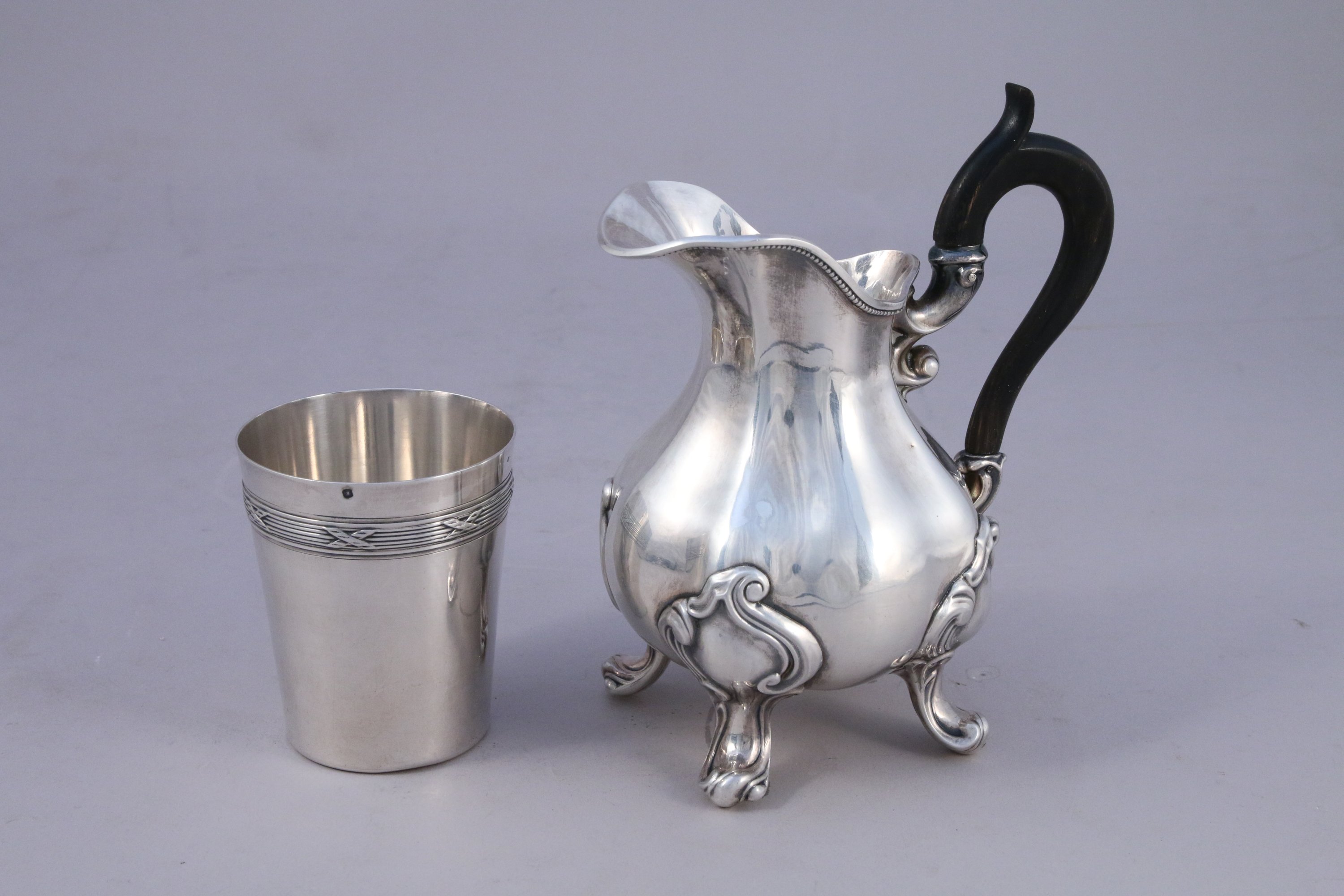 - TIMBALE tronconique à fond plat décorée d'une frise de jonc rubané et gravée d'un monogramme "L T". Poinçon Minerve, début XXe. Haut. 8,4, Diam. 7,4cm. Poids 97 g.